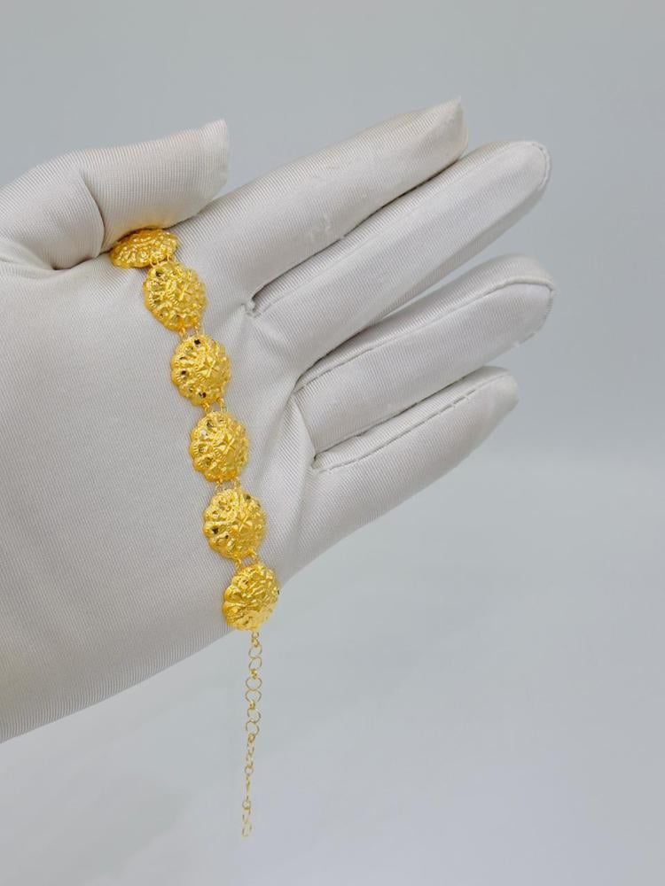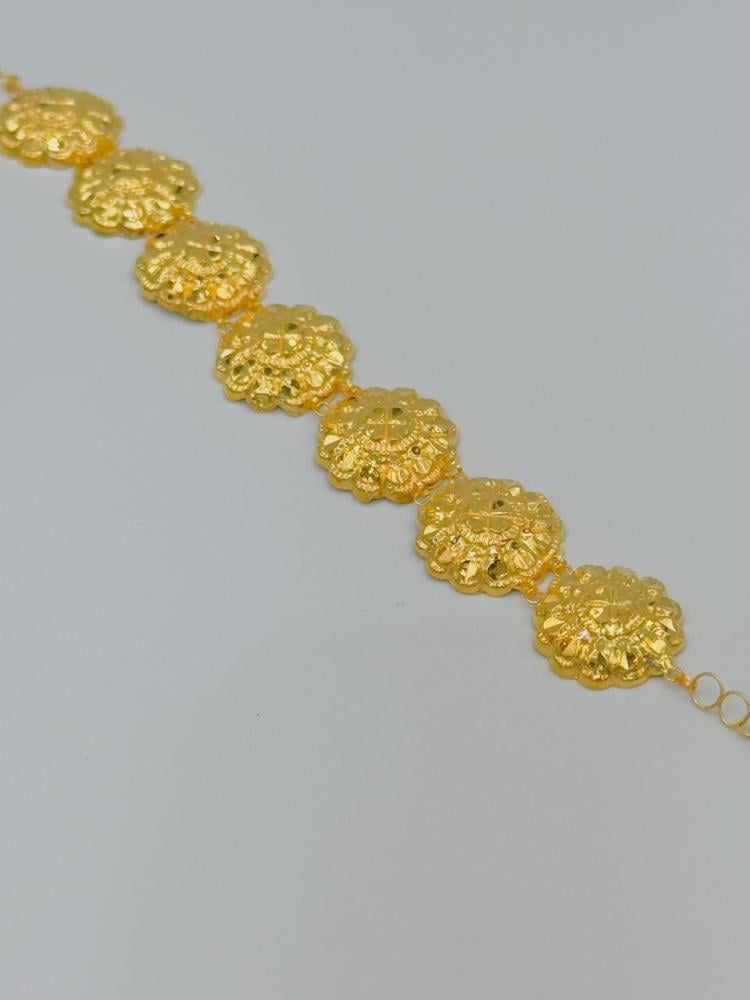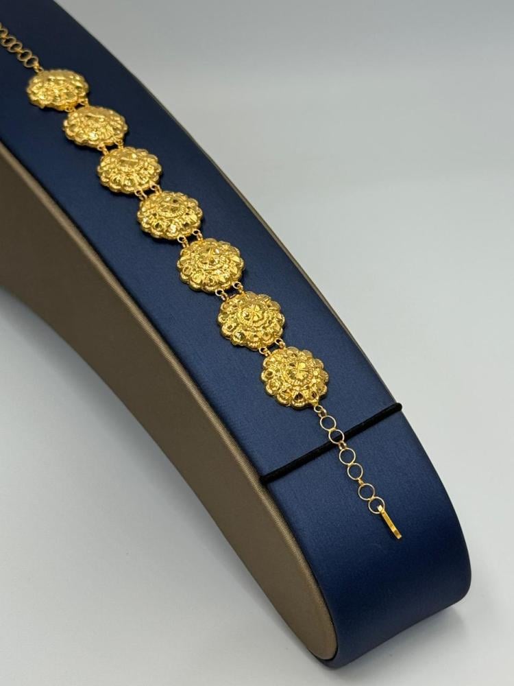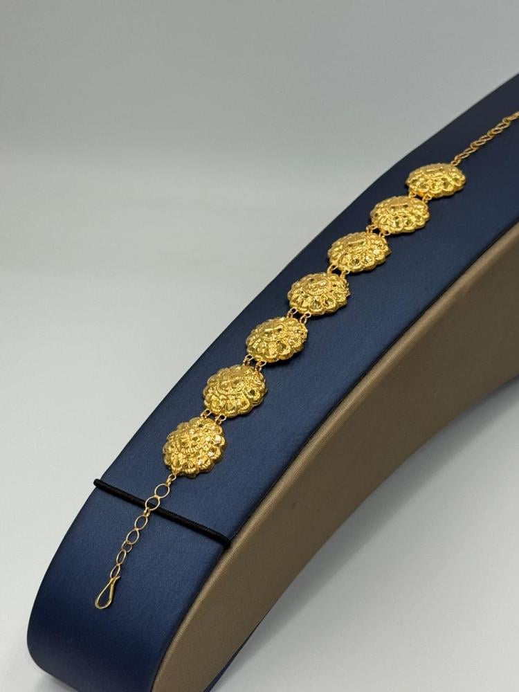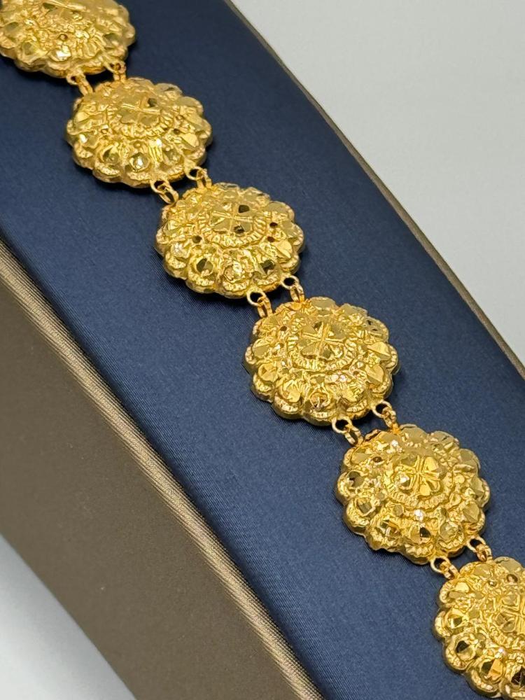 الوصف: اسوارة ذهب عيار 21 بتصميم وردات كرسي جابر المترابطة، تجمع بين الأصالة والفخامة في قطعة واحدة. تفاصيلها المتقنة تضفي لمسة من الأناقة الملكية على معصمك، ويمكن تعديل مقاسها بسهولة لتناسبك تماماً. مثالية للإطلالات الفاخرة والمناسبات الخاصة.