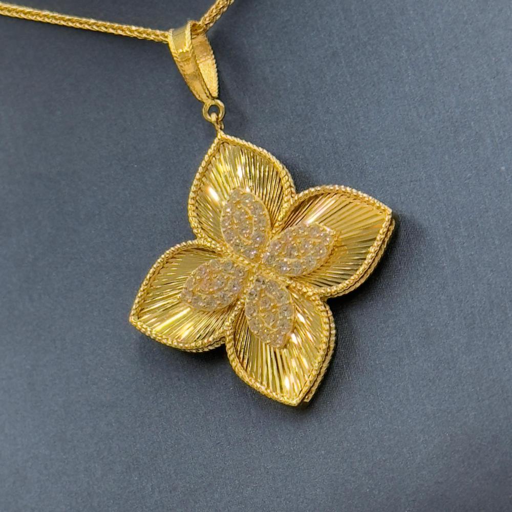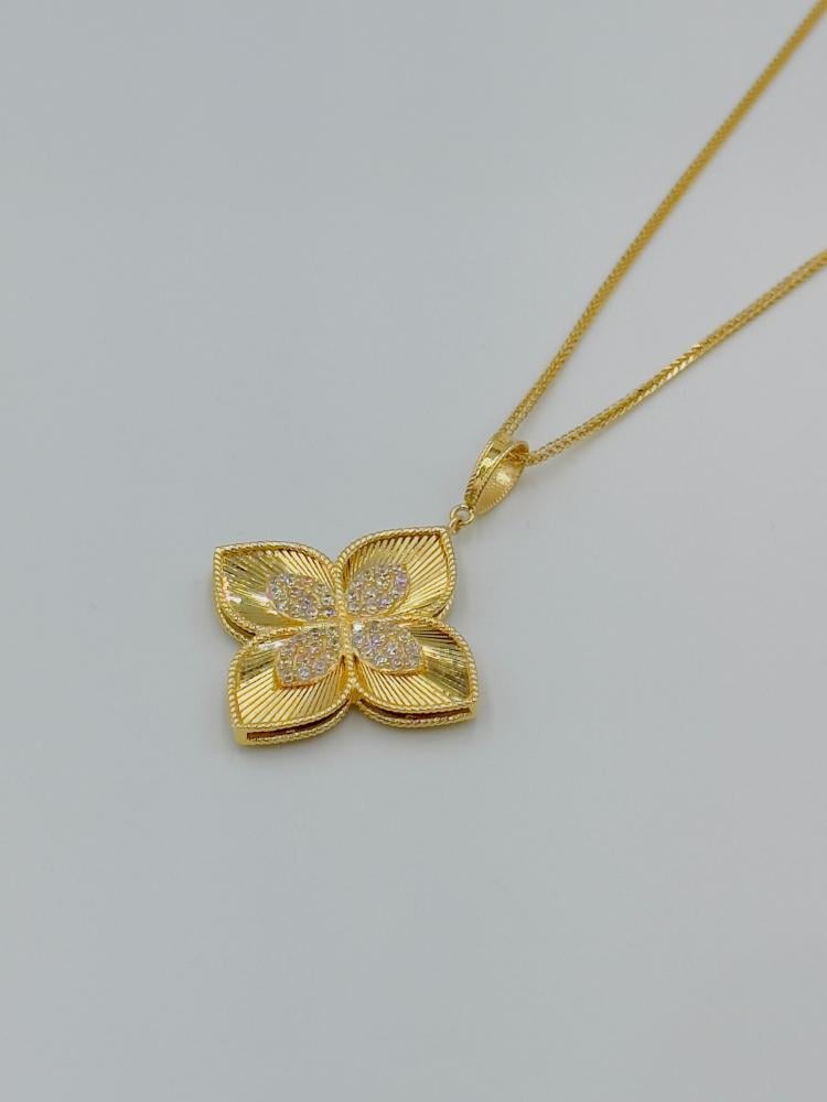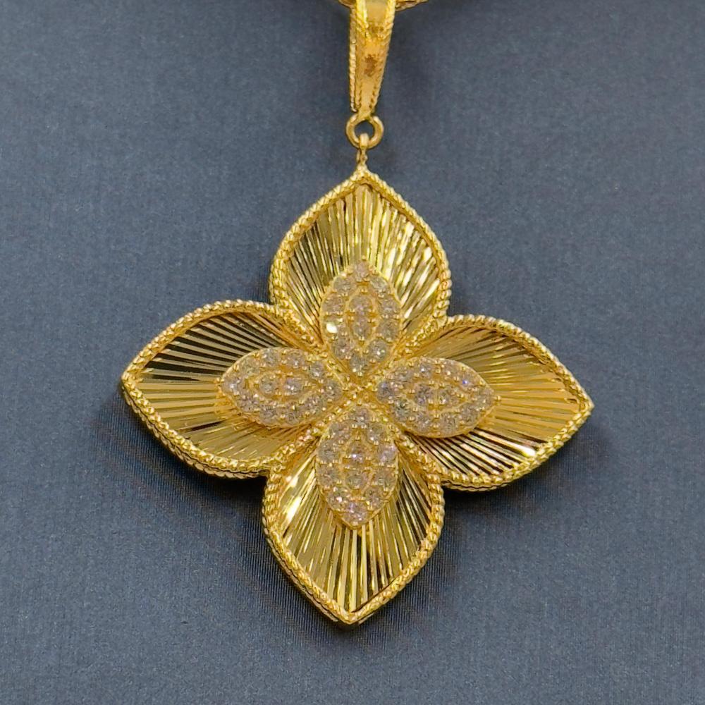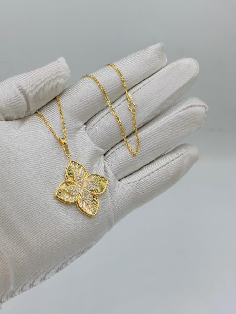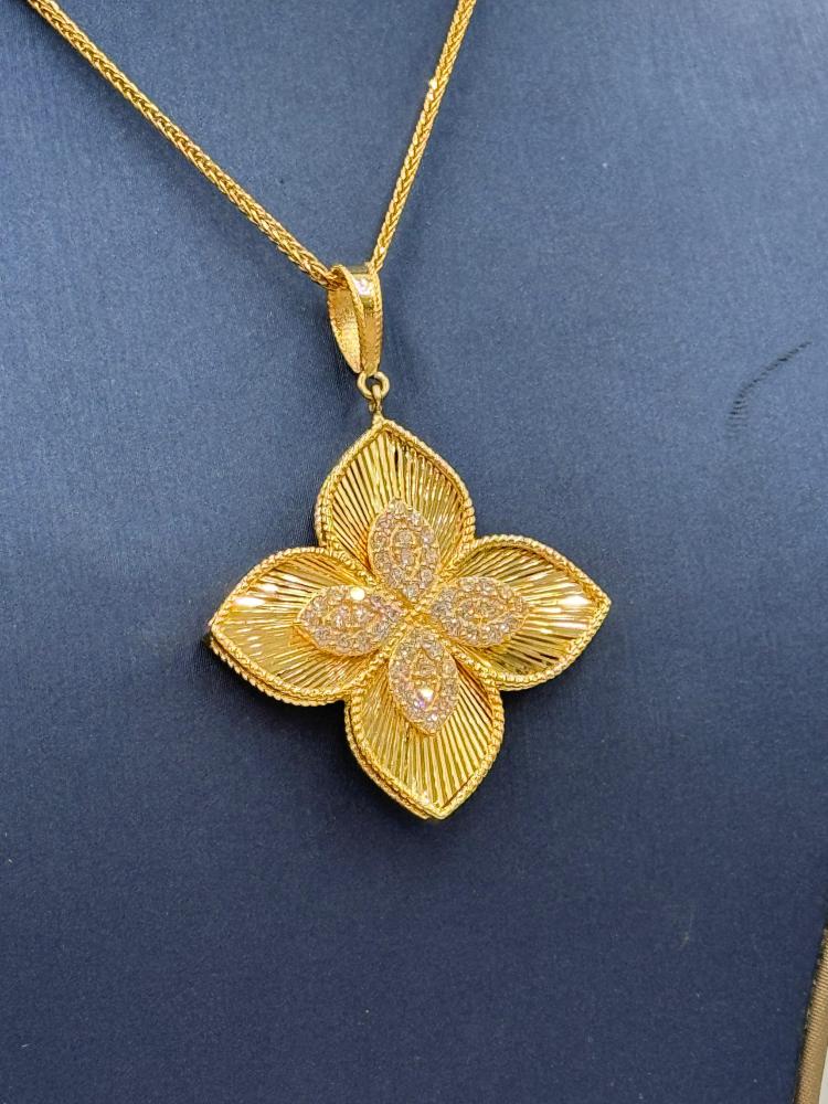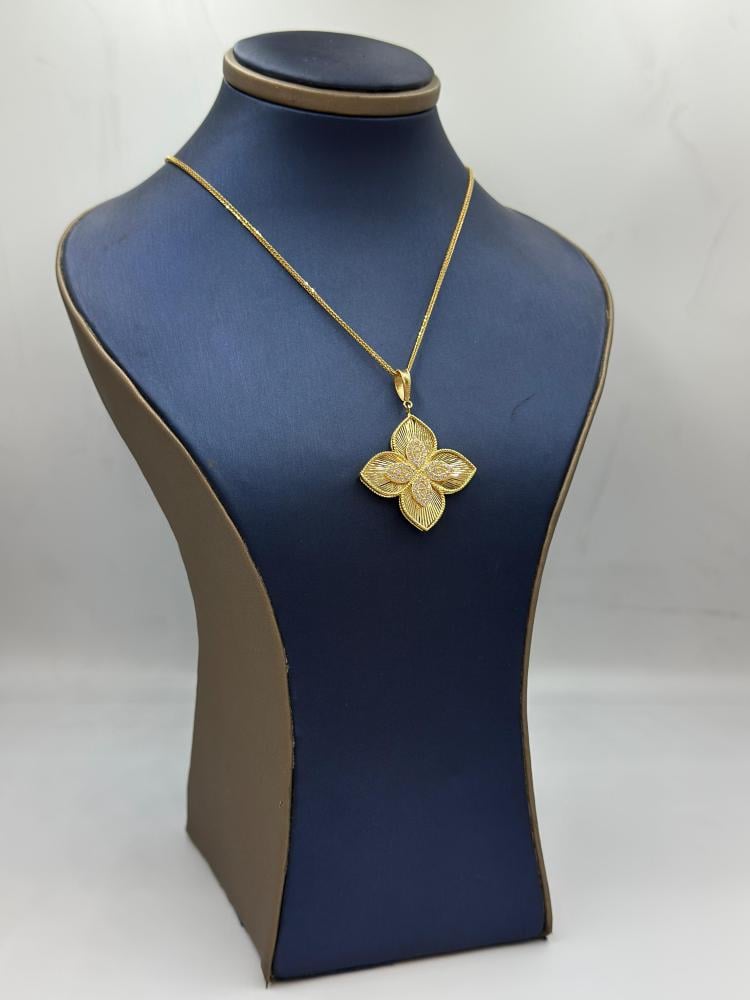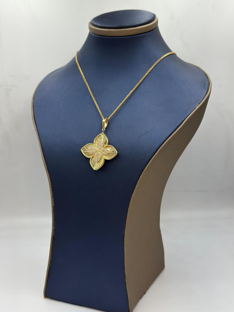🟡 وصف المنتج: سلسال بتعليقة روبرتو كوين ذهب عيار 18 – فخامة الزهرة المتألقةتألقي بإطلالة ملكية مع هذا السلسال الفاخر من تصاميم روبرتو كوين، المصنوع من ذهب عيار 18 ويزن 8.59 جرام. يتميز بتعليقة كبيرة بتصميم زهري أنيق يعكس الفخامة والدقة في التفاصيل، بطول 18 بوصة (44 سم) ليضفي توازنًا مثاليًا بين الجرأة والرقي.