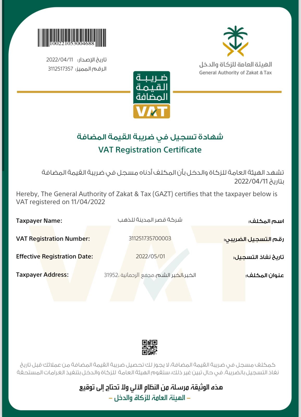شهادة تسجيل في ضريبة القيمة المضافة