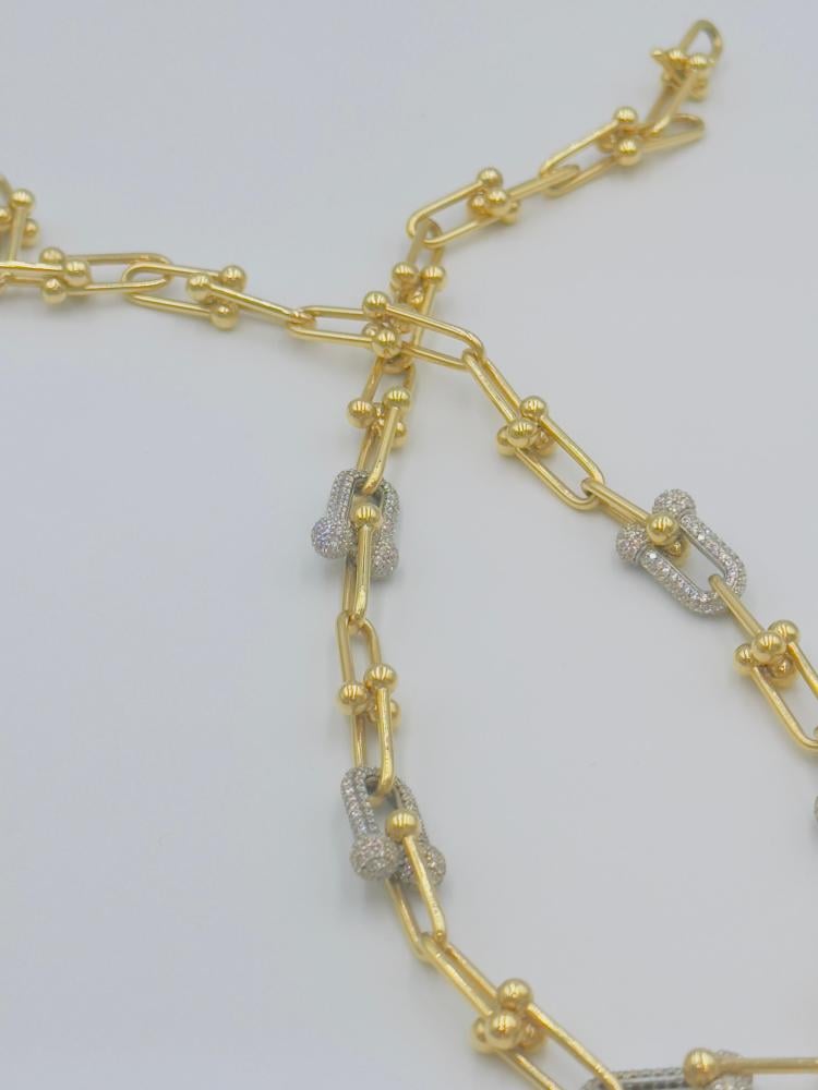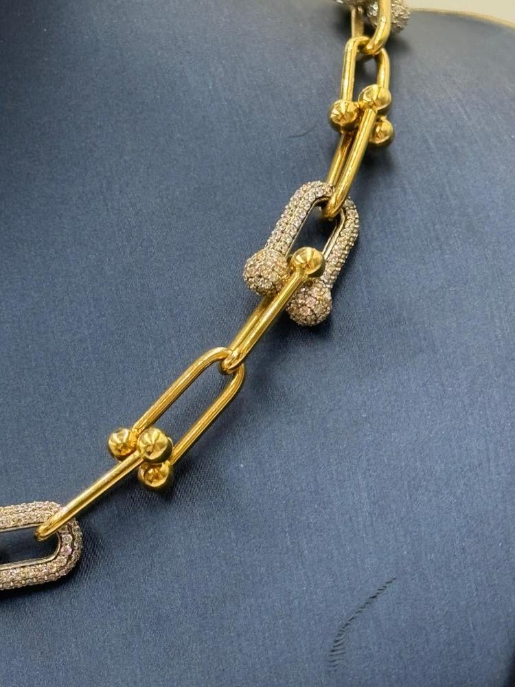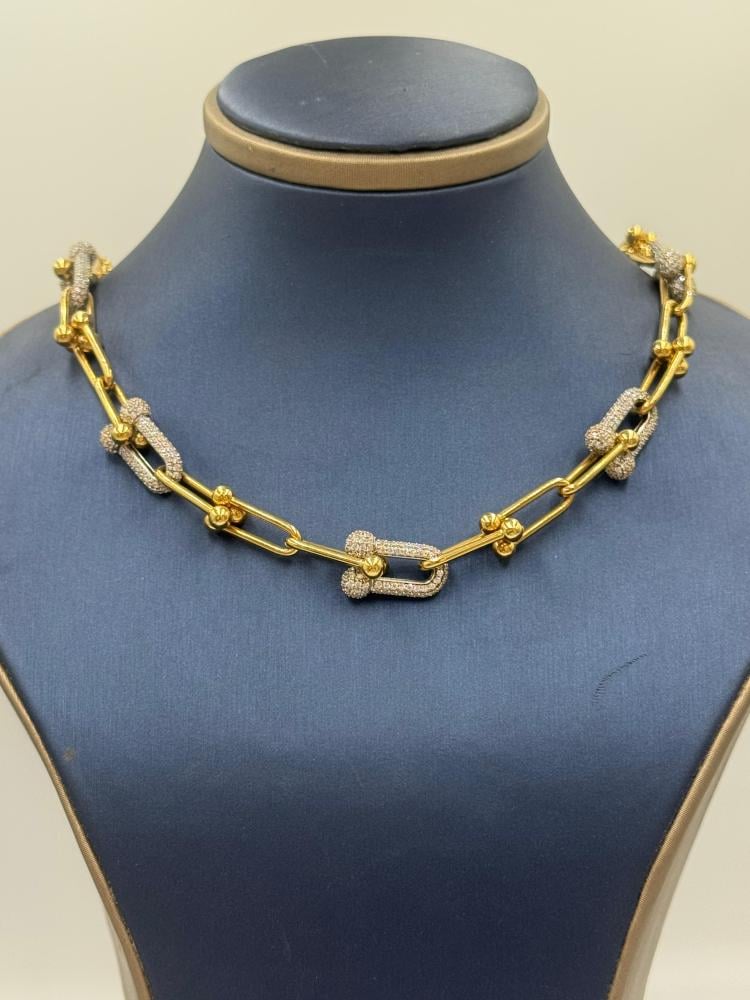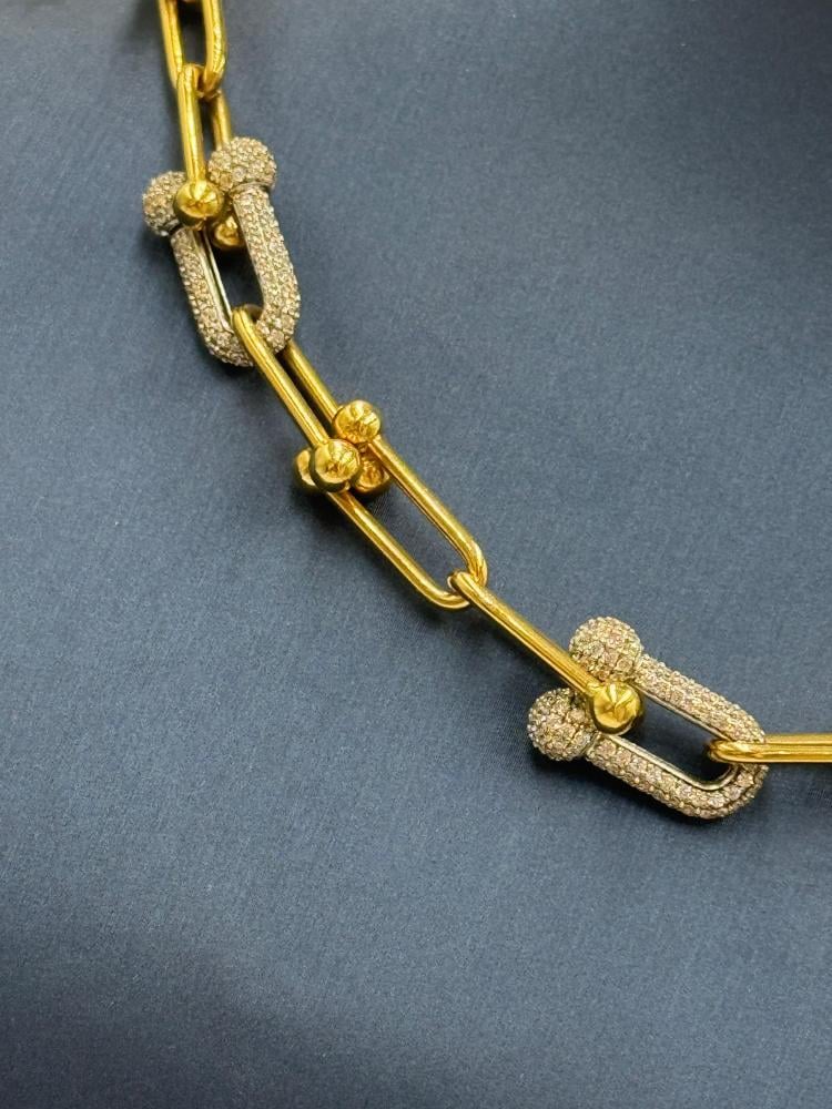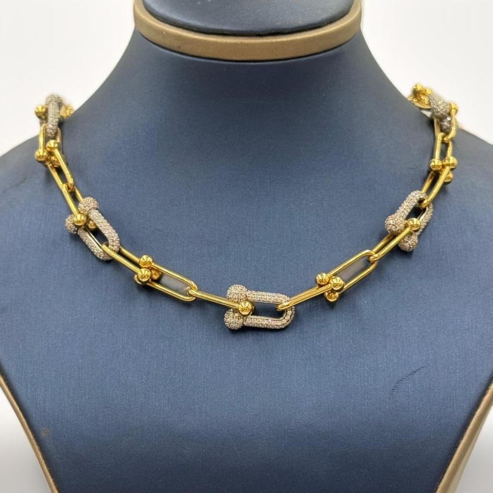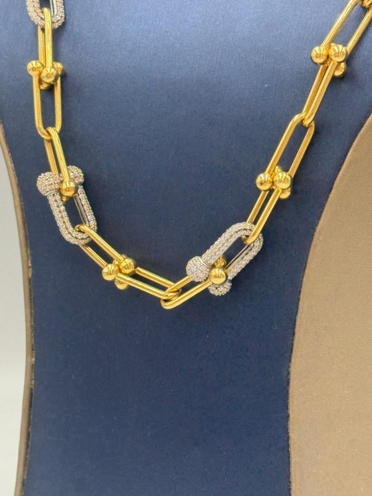 ارتقي بإطلالتك مع عقد تيفاني ذهب عيار 18 بفصوص خفيفة – قطعة تجمع بين الرقي والبساطة بوزن 30.39 جرام وطول 44 سم. تصميم راقٍ يليق بذوقك، ويلمع بنعومة تناسب جميع المناسبات. مثالي كهدية فاخرة أو إضافة أنيقة لمجوهراتك الخاصة.