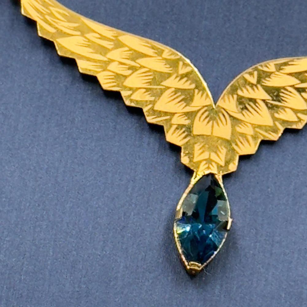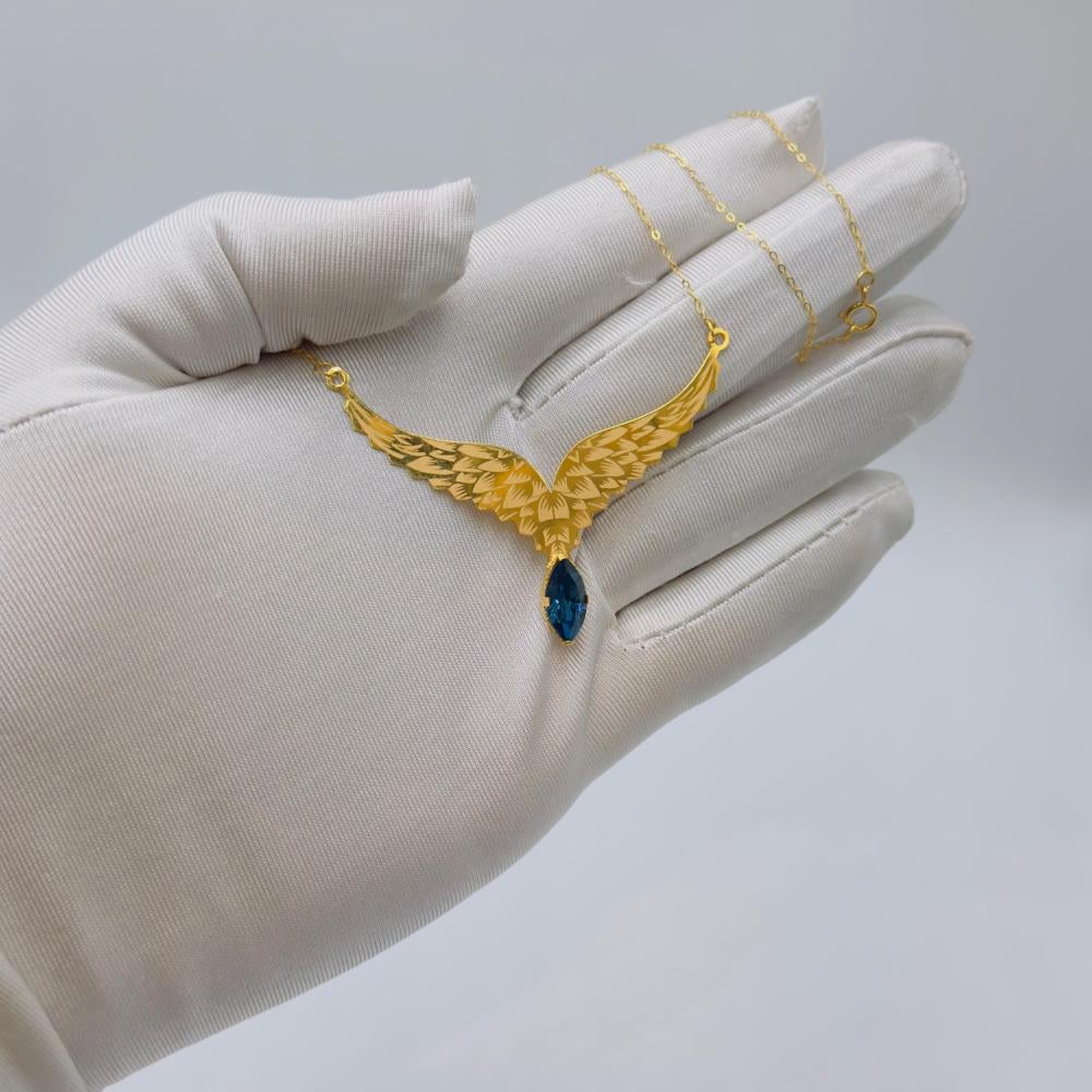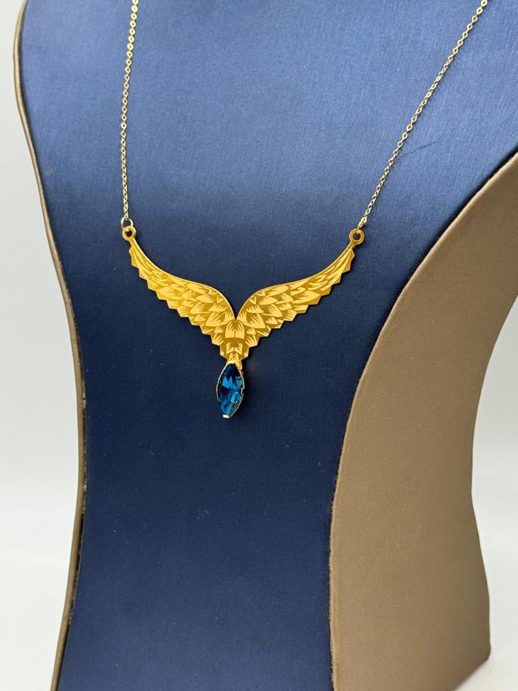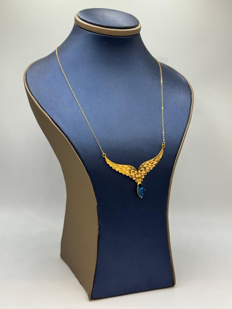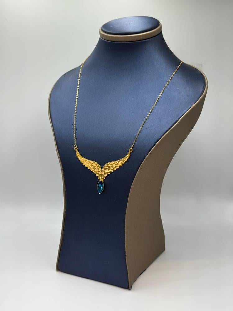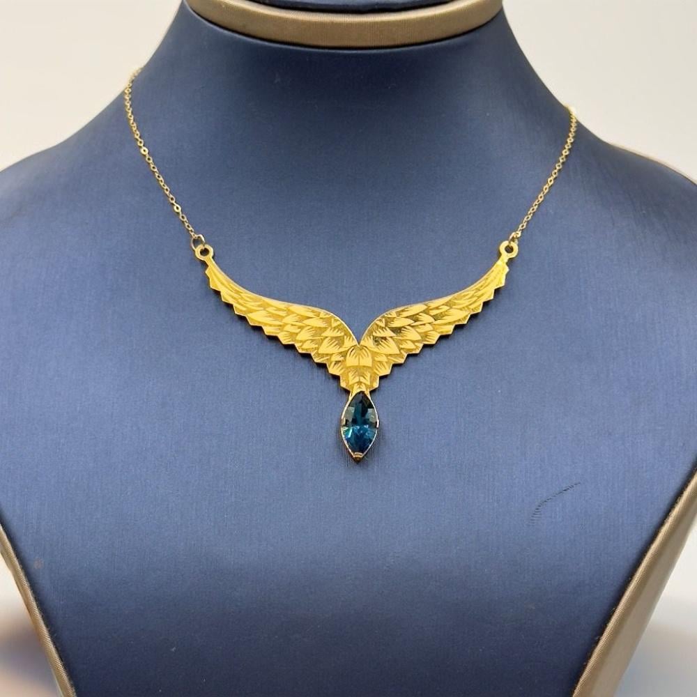 🔹 الوصف: عقد فخم من الذهب عيار 21 يتميز بتعليقة أنيقة على شكل جناح صقر، مزين بفص أزرق لافت يرمز للقوة والتميّز. يزن 3.95 جرام ويأتي بطول 22 بوصة (55 سم)، ليمنحك إطلالة ملكية تلفت الأنظار. تصميمه يجمع بين الرمزية والجمال، مثالي لعشاق الفخامة والتفرّد.