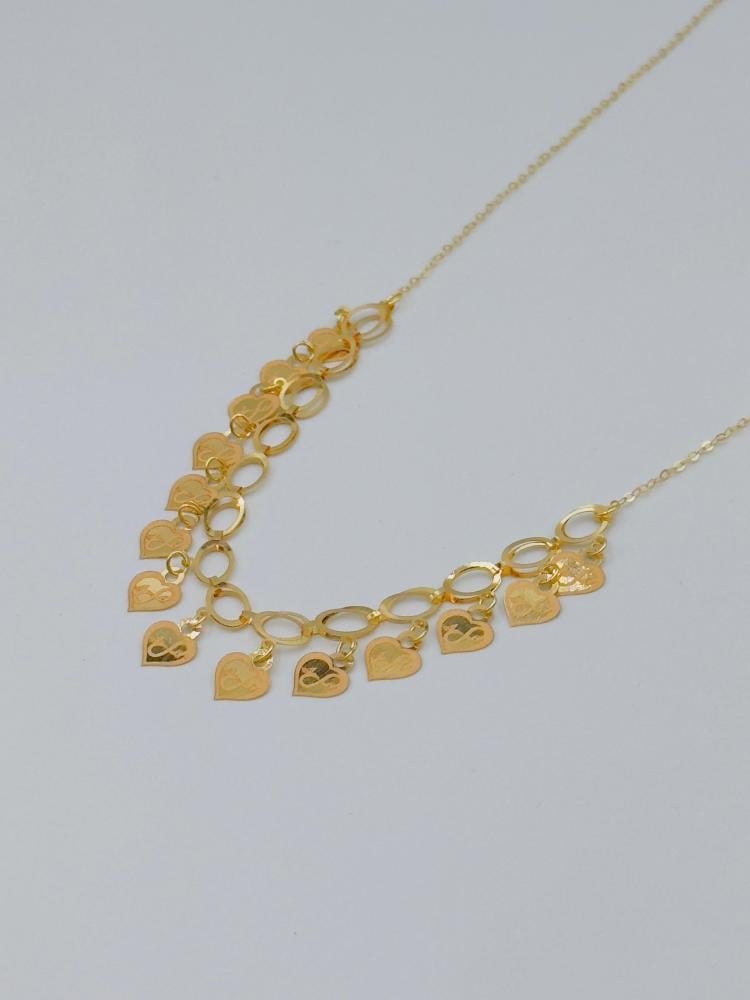 - التصميم: عقد بحلقات متصلة تتدلّى منها قلوب منقوشة