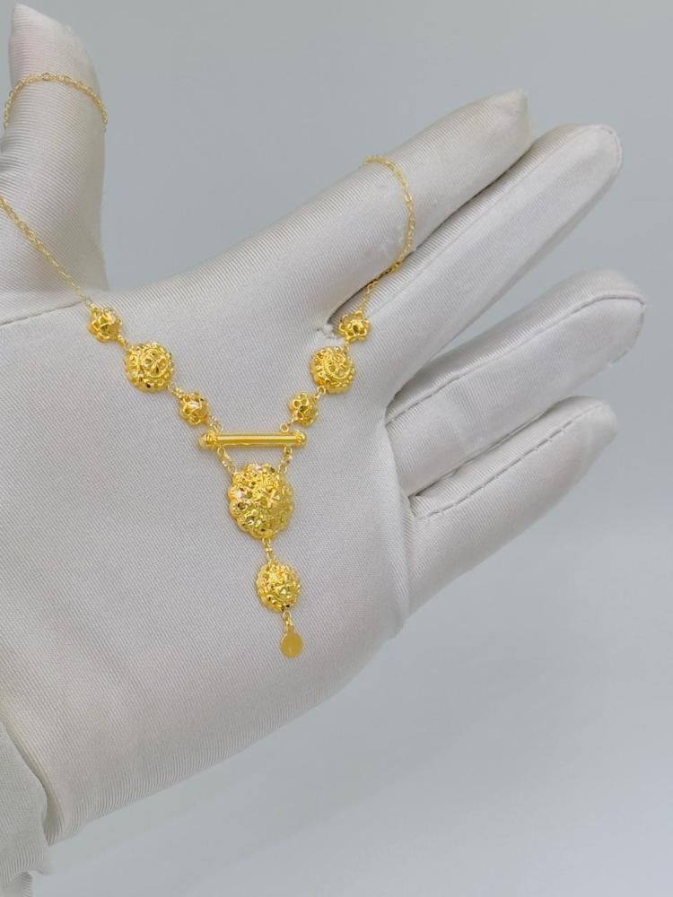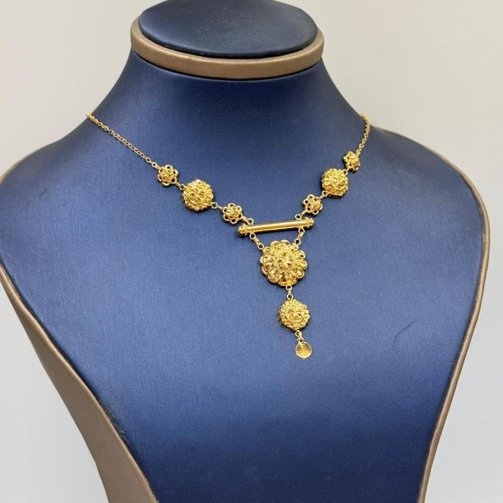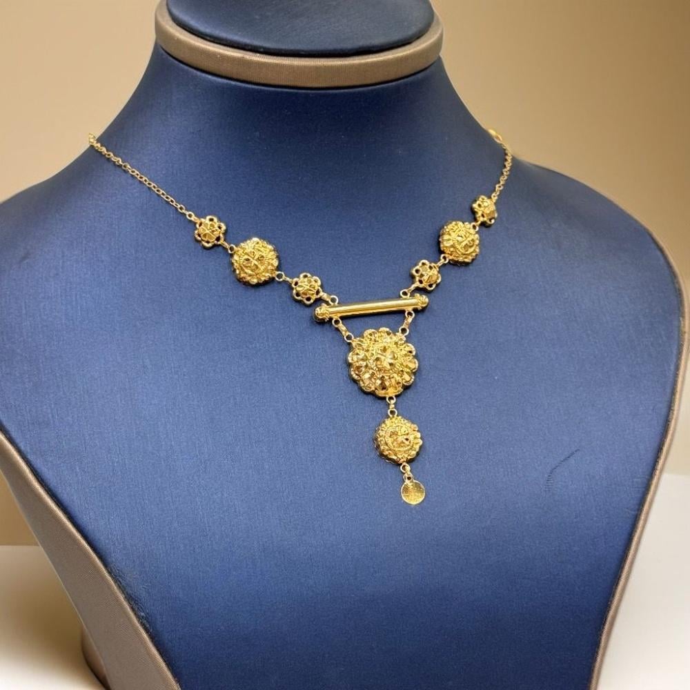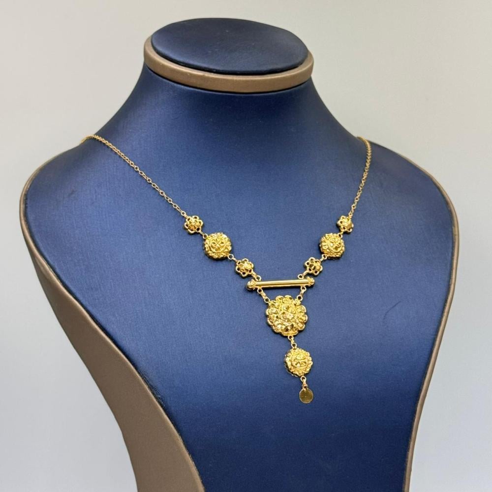 الوصف: عقد كرسي جابر من ذهب عيار 21 يتميز بتصميمه الكلاسيكي الأنيق ولمعانه الآسر الذي يعكس الذوق الرفيع والفخامة في كل تفصيلة. قطعة راقية تبرز جمالك وتضيف لمسة من الرقي لإطلالتك اليومية أو لمناسباتك الخاصة.