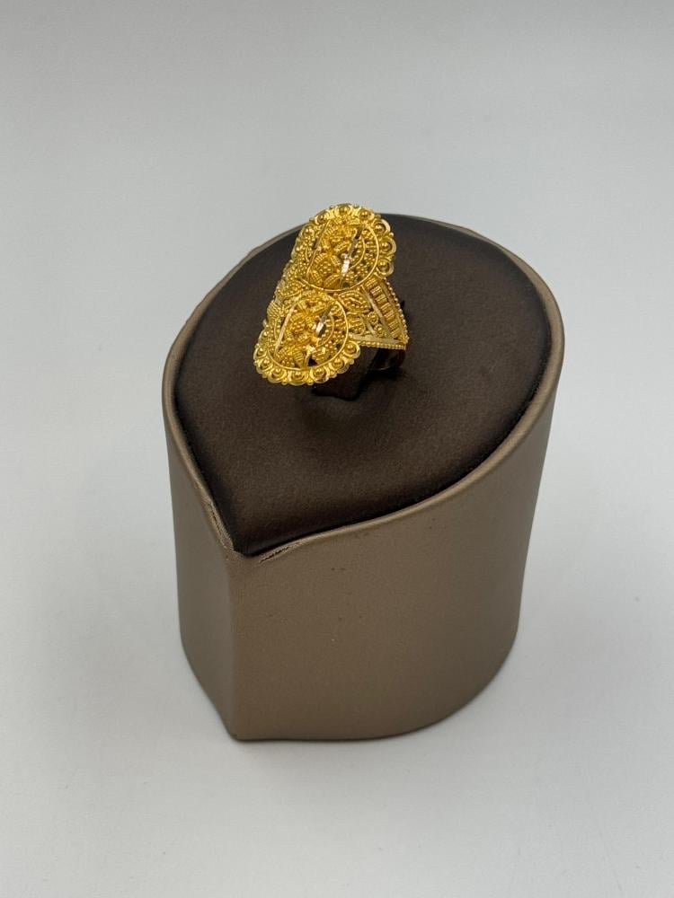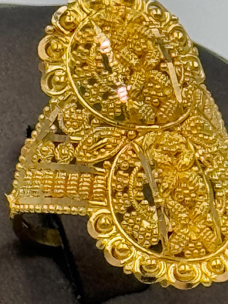 أضيفي لمسة من الجمال والفخامة إلى إطلالتك مع هذا الخاتم الذهبي عيار 22 المصمم بأسلوب هندي مميز. بوزن 5.20 جرام من الذهب الخالص، يجسد هذا الخاتم روعة الحرفية ودقة التفاصيل، ليكون قطعة فريدة تليق بجميع المناسبات.
