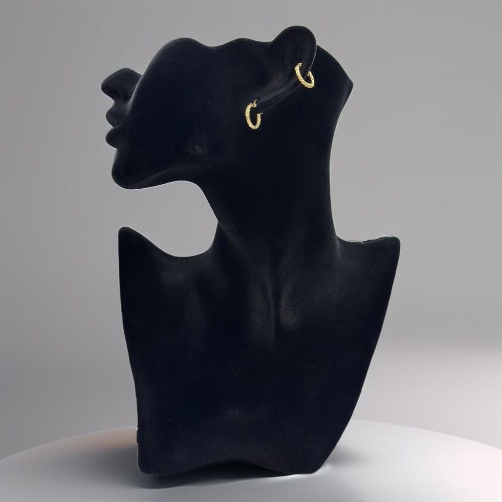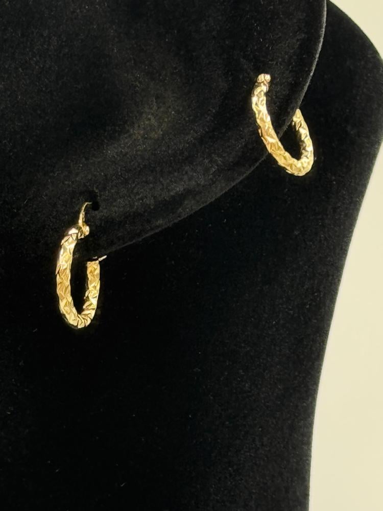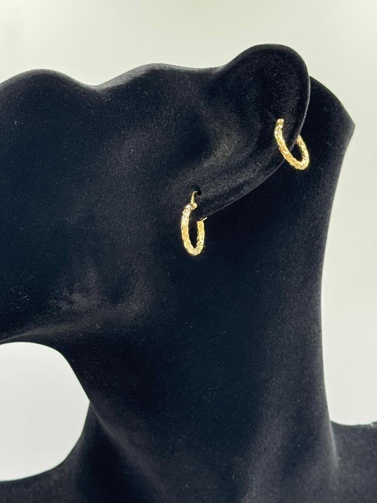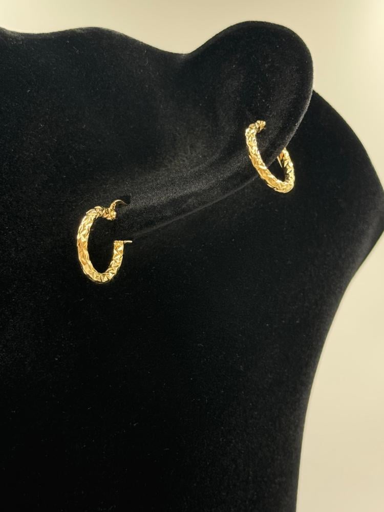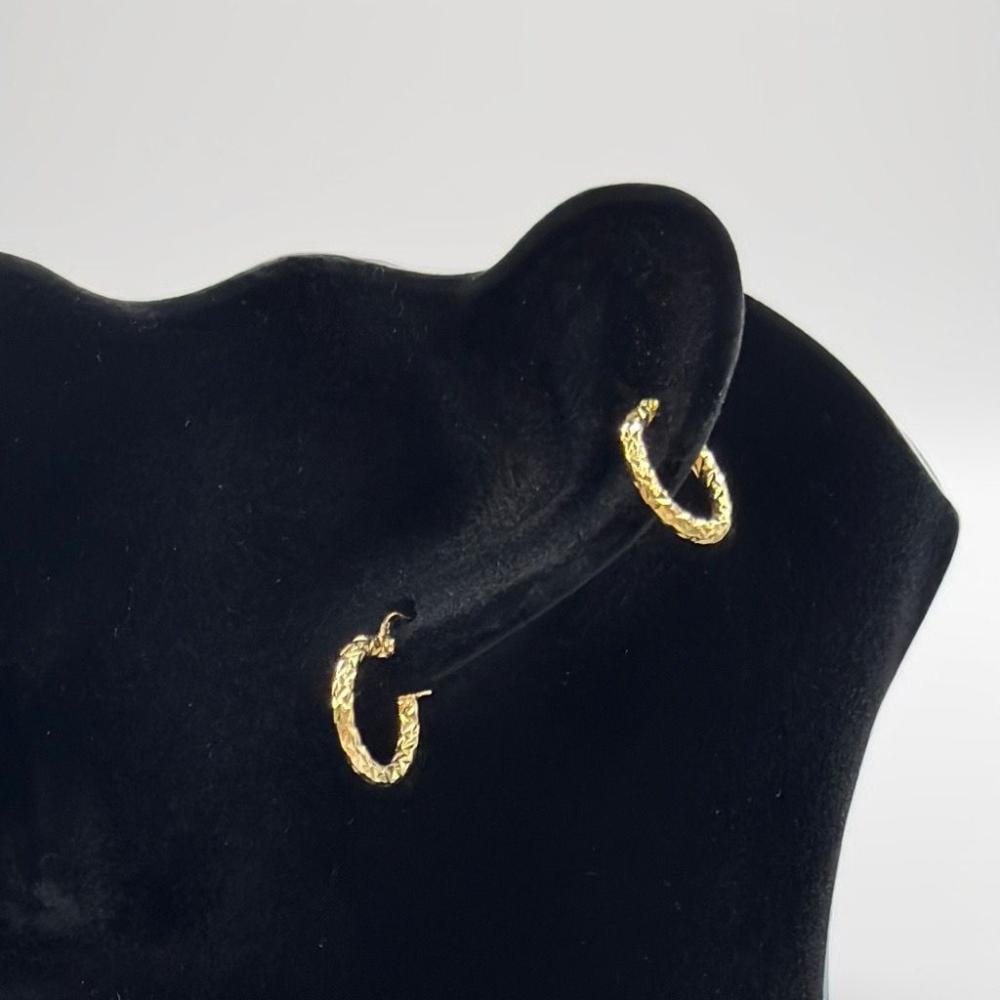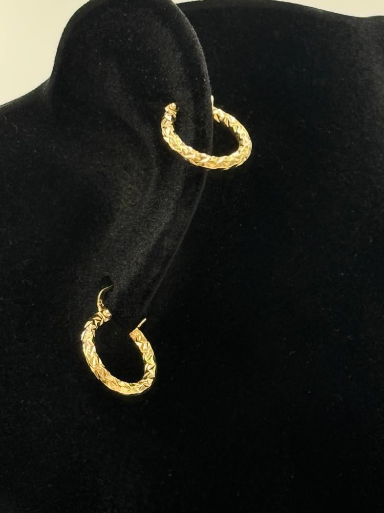 حلق ذهب عيار 18 بوزن 0.90 جرام بتصميم محفور لامع، مثالي للإطلالة اليومية أو المناسبات الخاصة. خفيف وأنيق من الذهب الأصلي. اكتشفيه الآن!