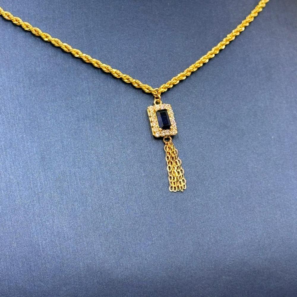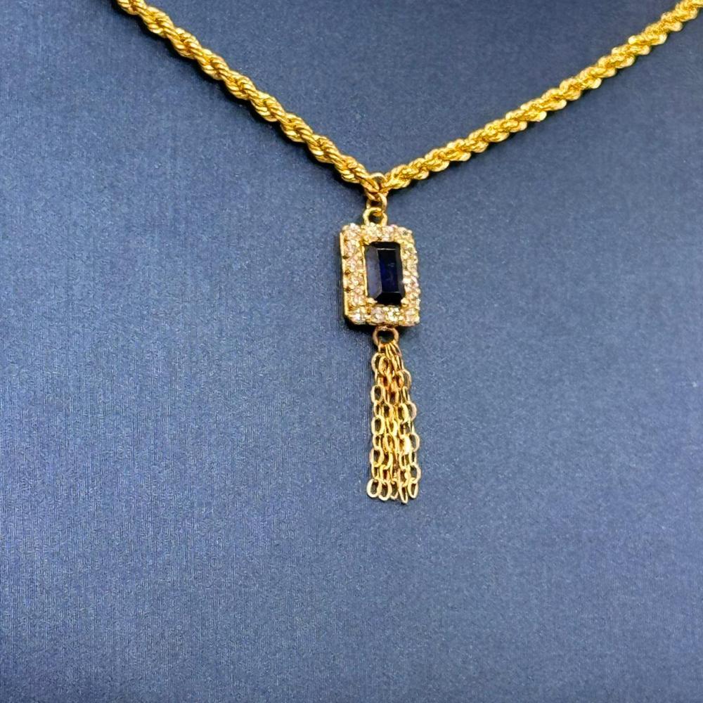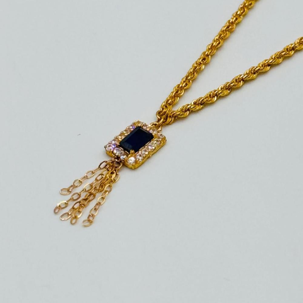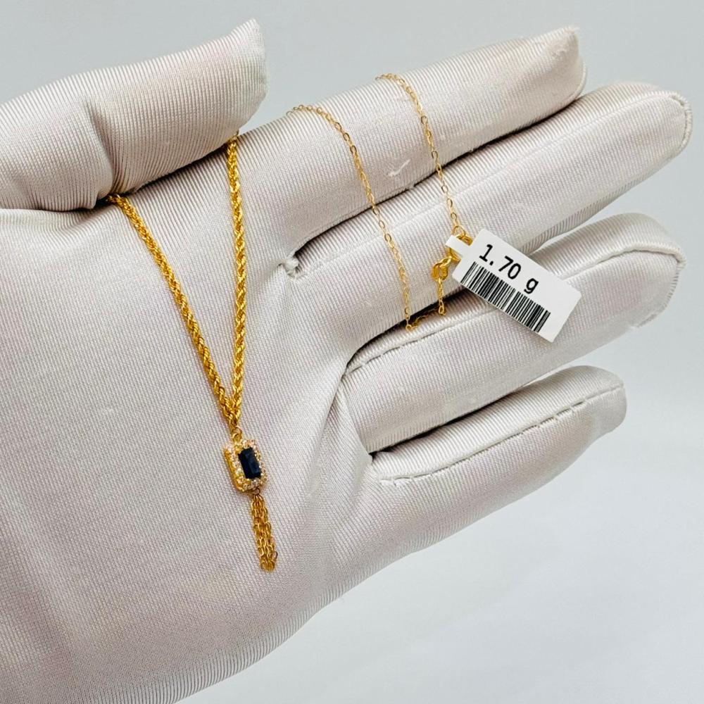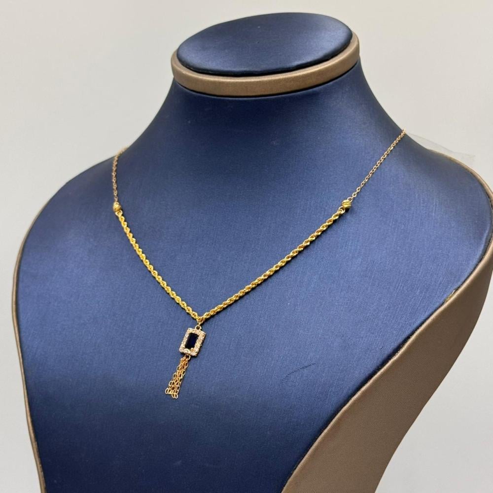 🔹 الوصف: عقد ذهب أنيق عيار 21 يتميز بتصميم راقٍ يتوسطه فص مربع باللون البنفسجي محاط بفصوص صغيرة لامعة باللون الأبيض تضيف لمعة ساحرة وجاذبية استثنائية. قطعة مثالية تضيف لمسة فخامة وأنوثة لكل إطلالة.
