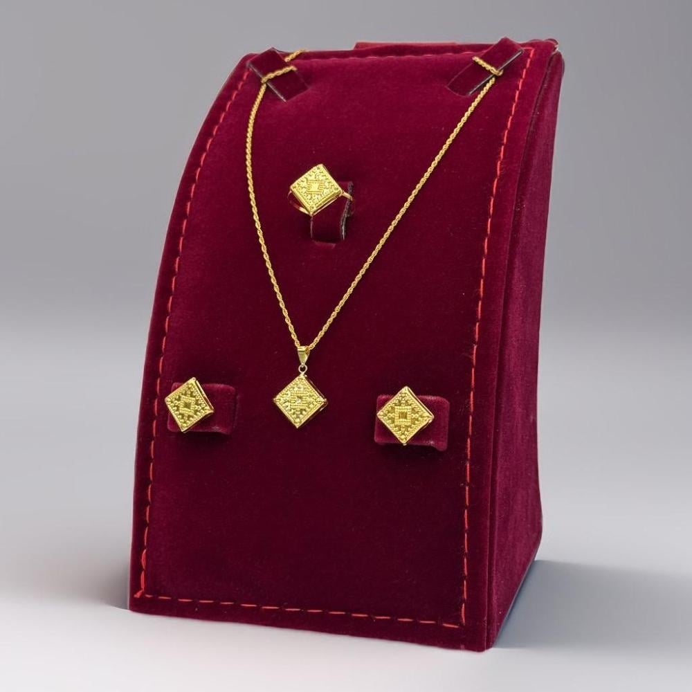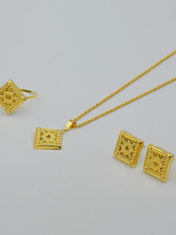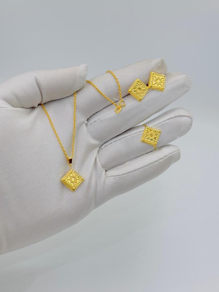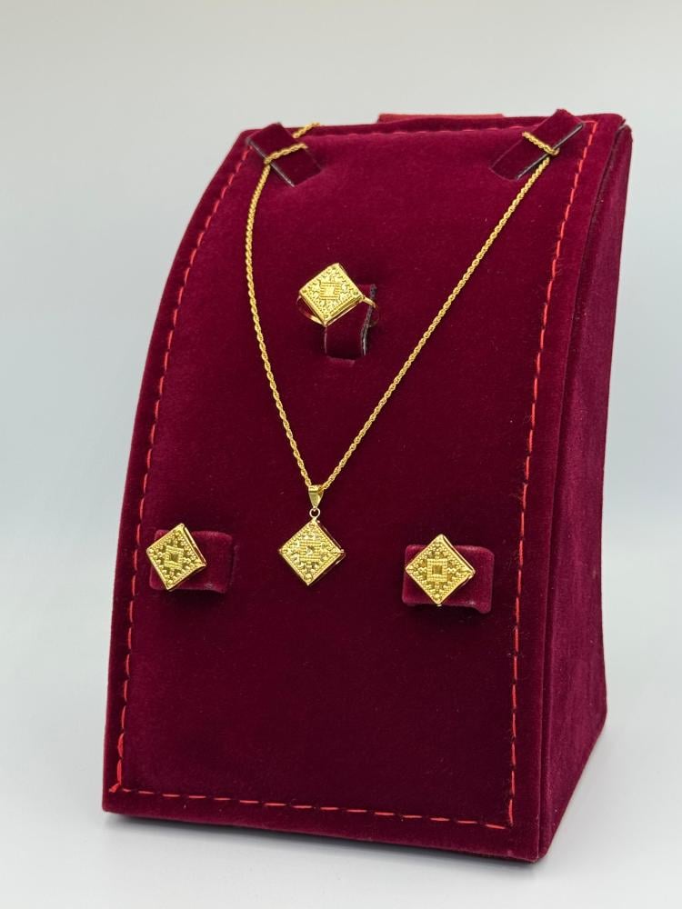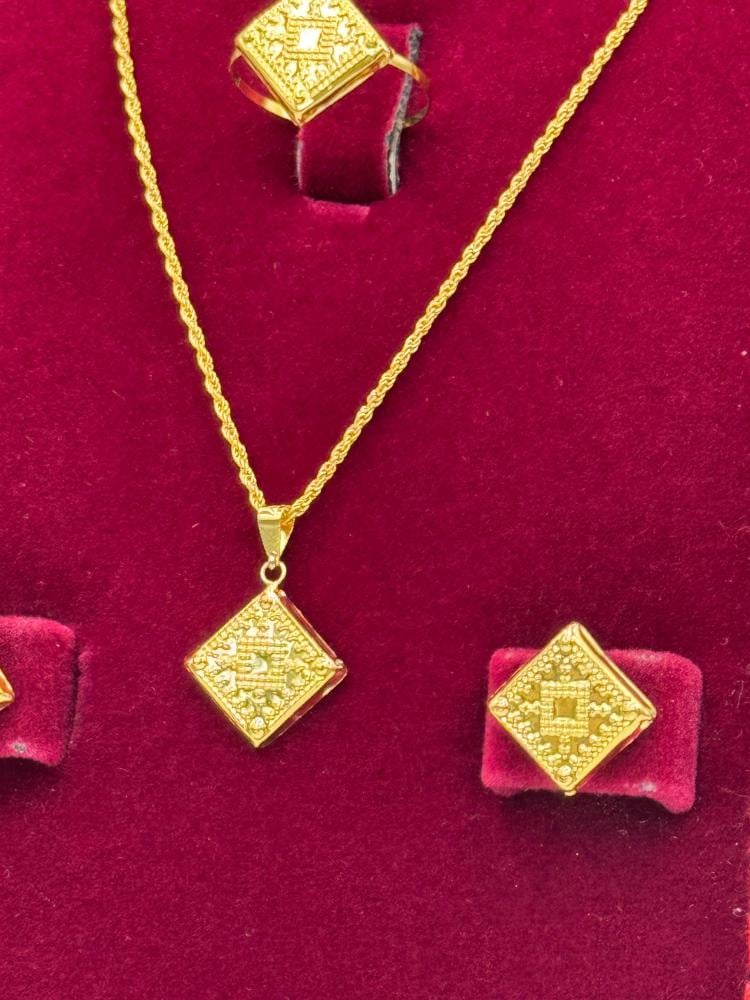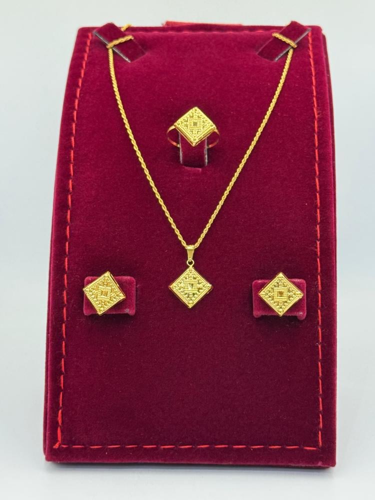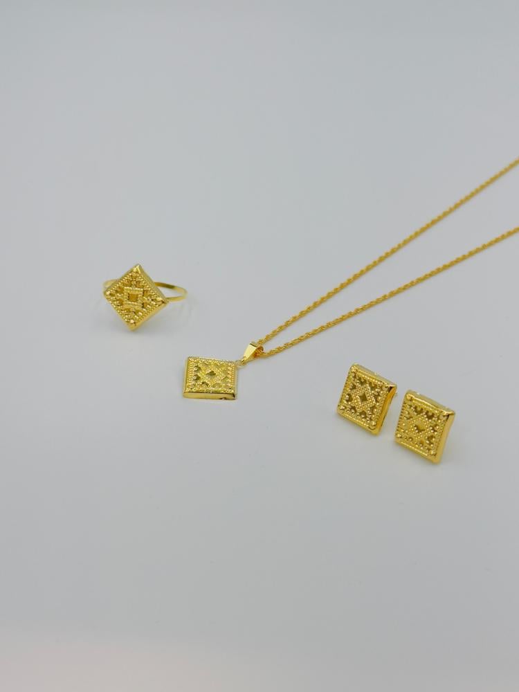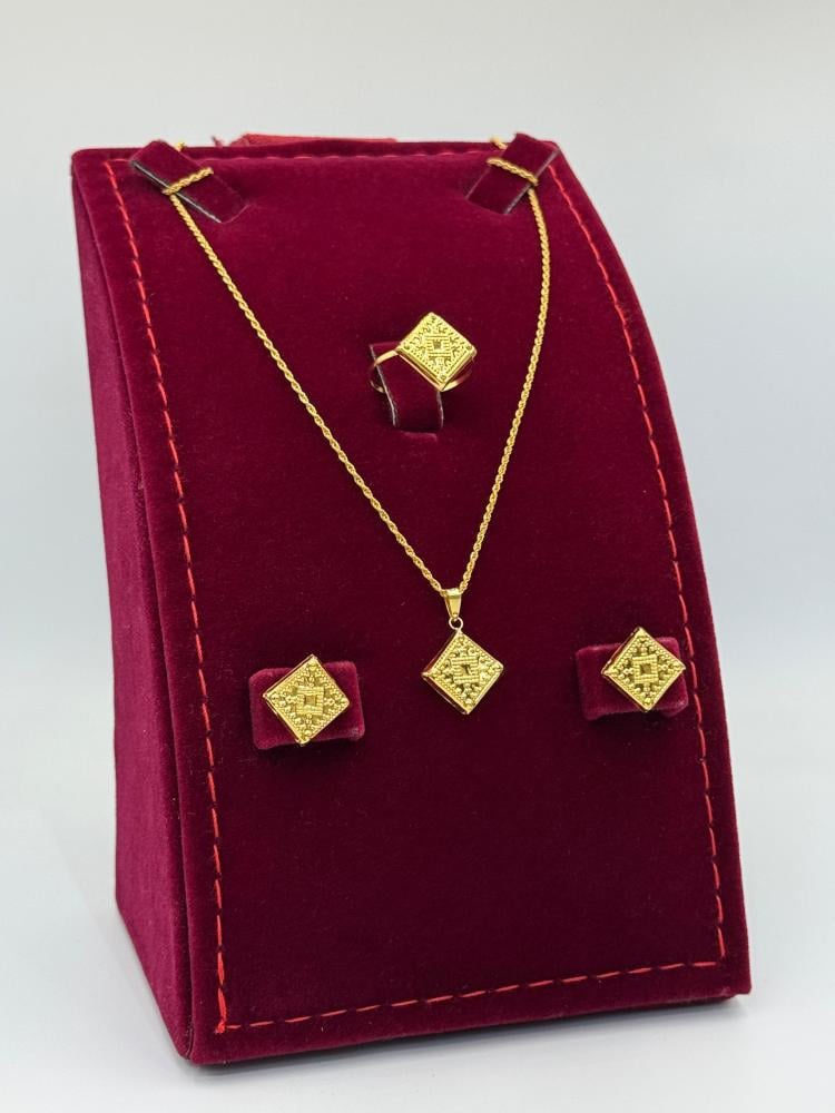 - المحتويات: عقد + حلق + خاتم (أو حسب التشكيلة)