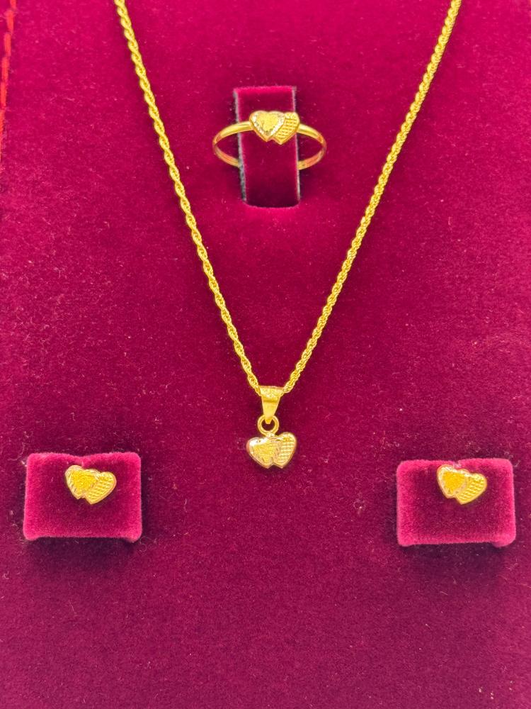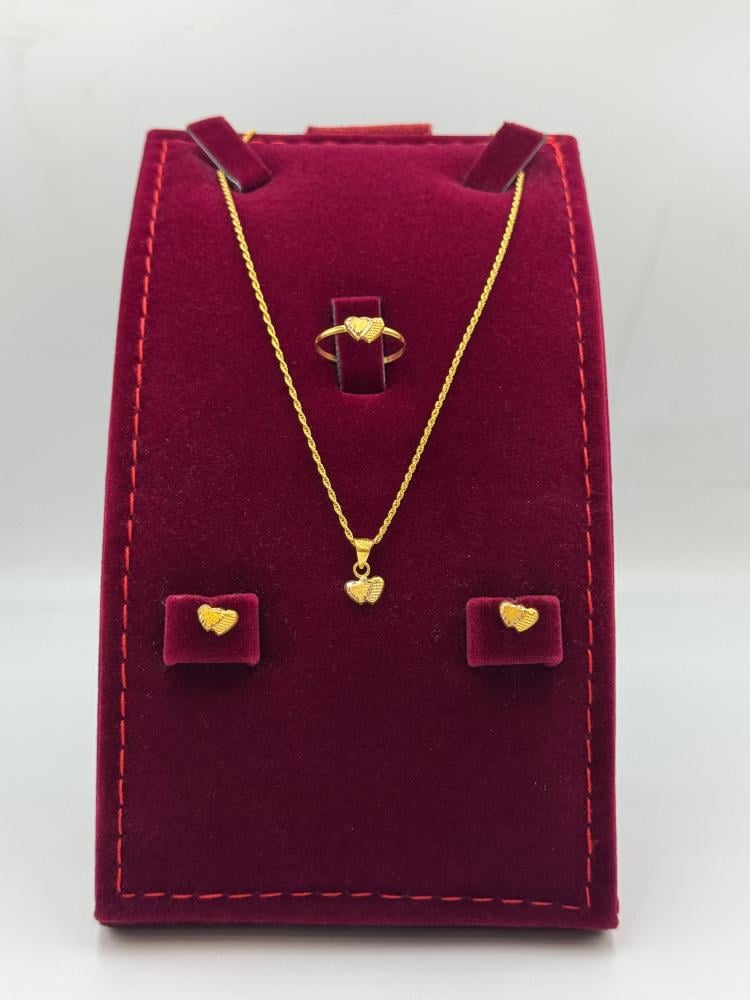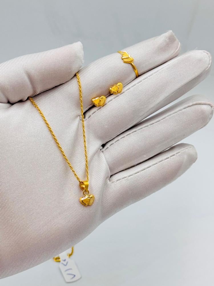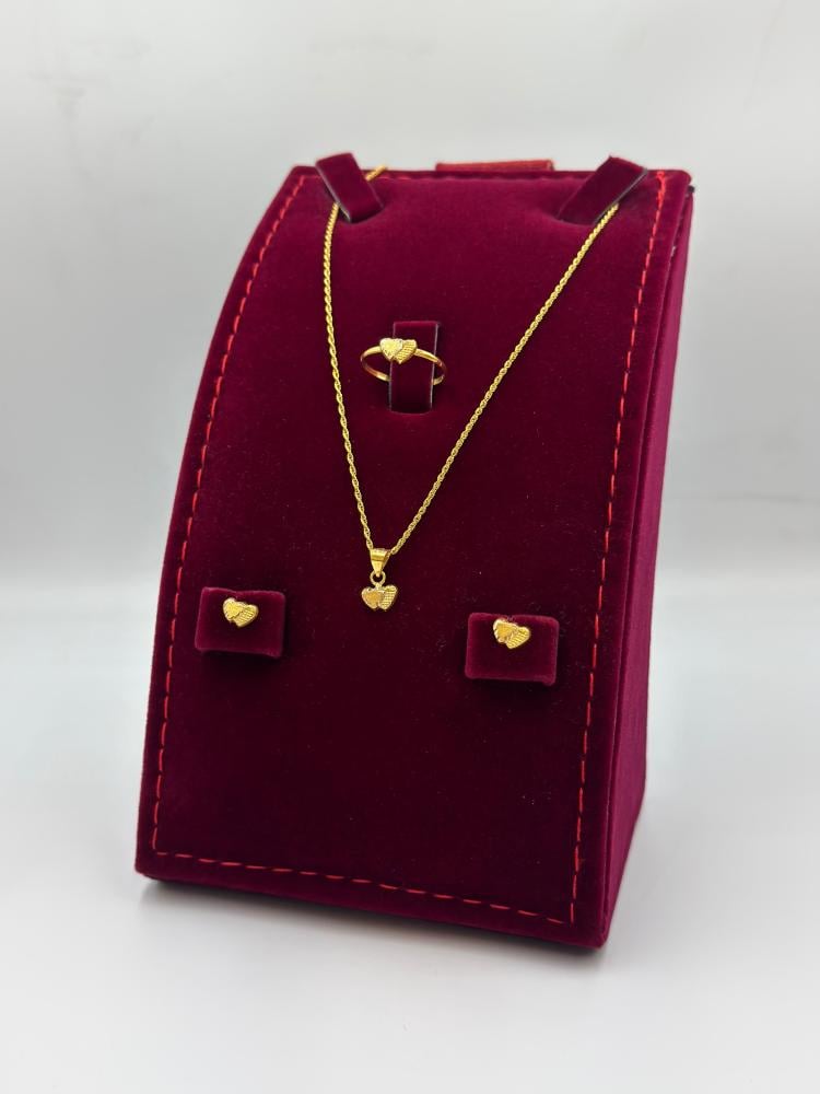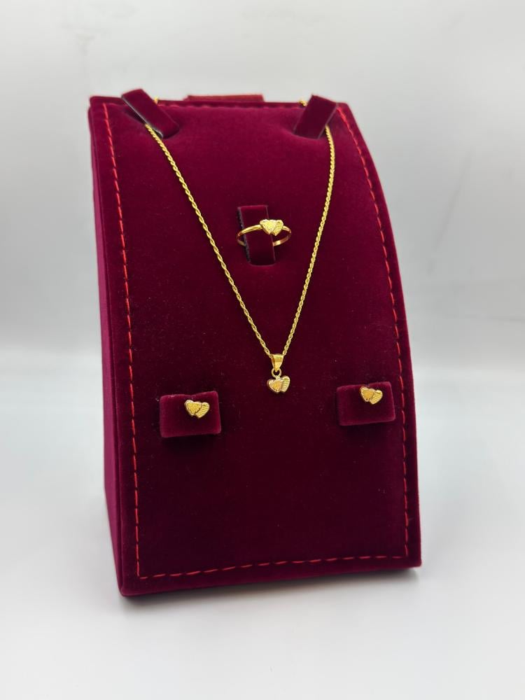 💛 Product Description: 18K Gold Jewelry Set with Elegant Heart DesignAdd a delicate touch of charm and elegance to your look with this luxurious 18K gold jewelry set, featuring finely detailed heart-shaped elements that symbolize love and femininity. The set includes a necklace with a heart pendant, matching earrings, and a coordinating ring — perfect for adding graceful style to any occasion.