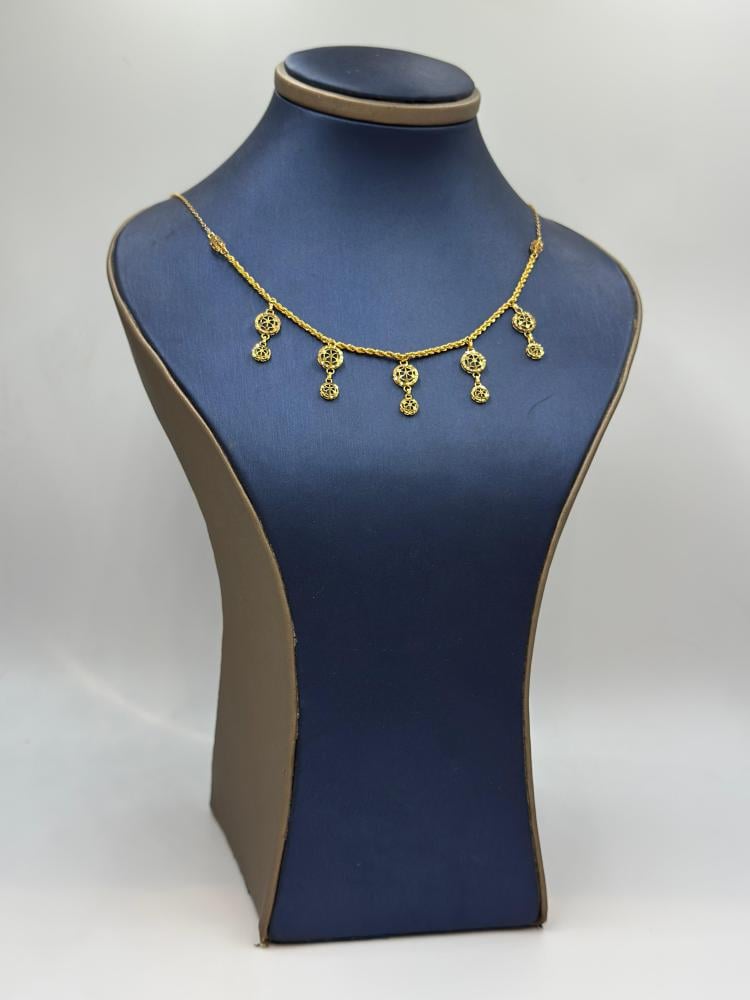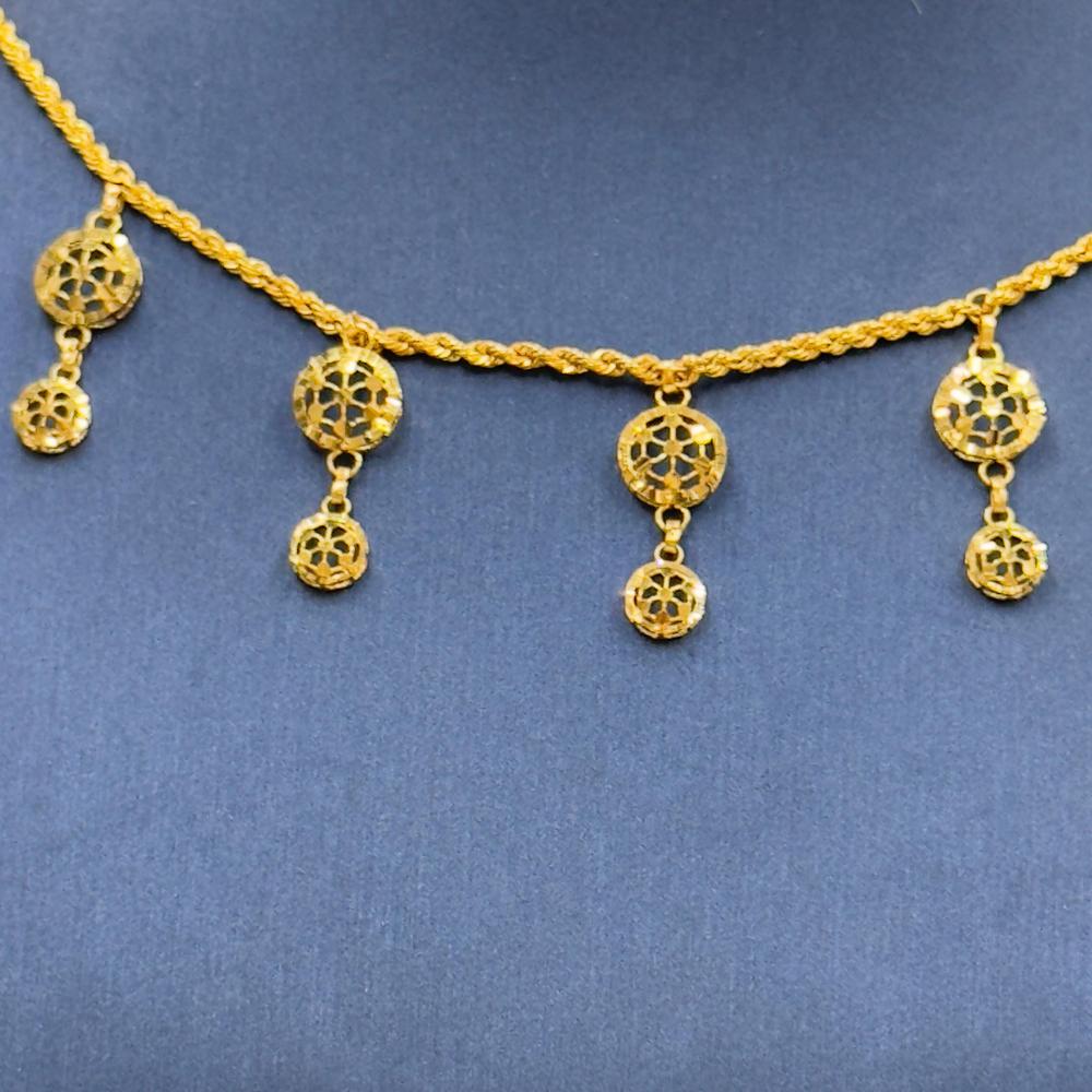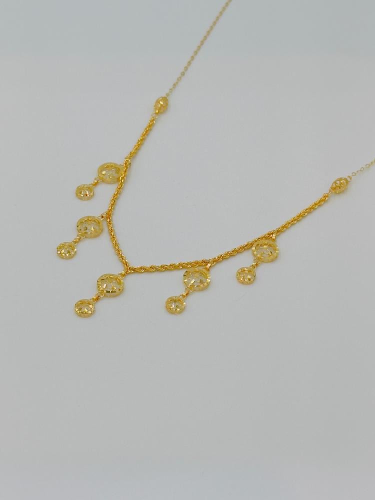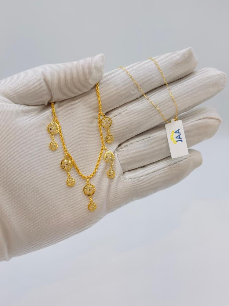 📦 Product Description: A stunning 21K gold necklace weighing 2.77 grams and measuring 18 inches (44 cm) in length. Designed with a twisted chain and intricate dangling charms that add elegance, movement, and a refined feminine touch. Perfect for special occasions or as a standout daily piece.