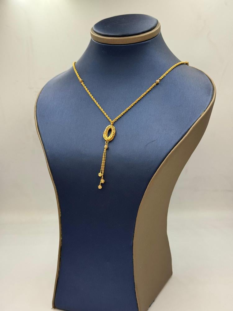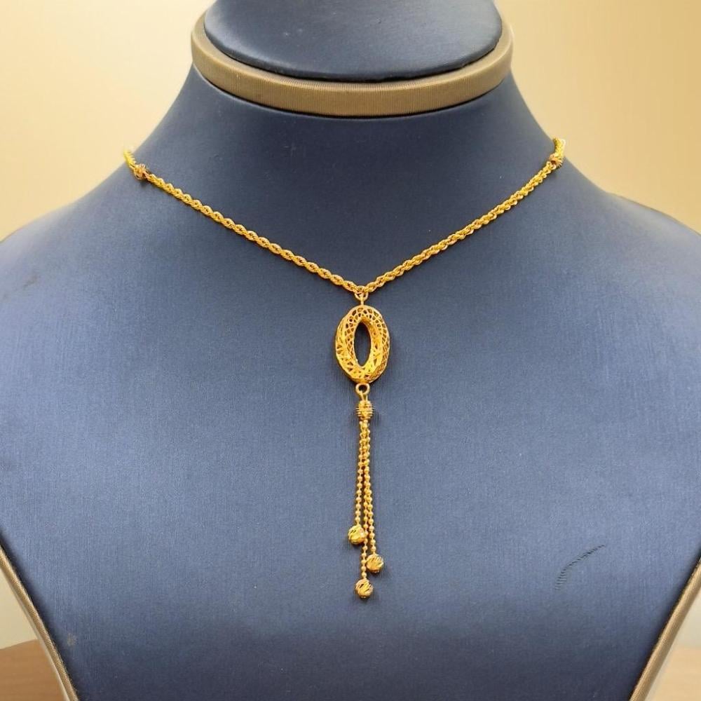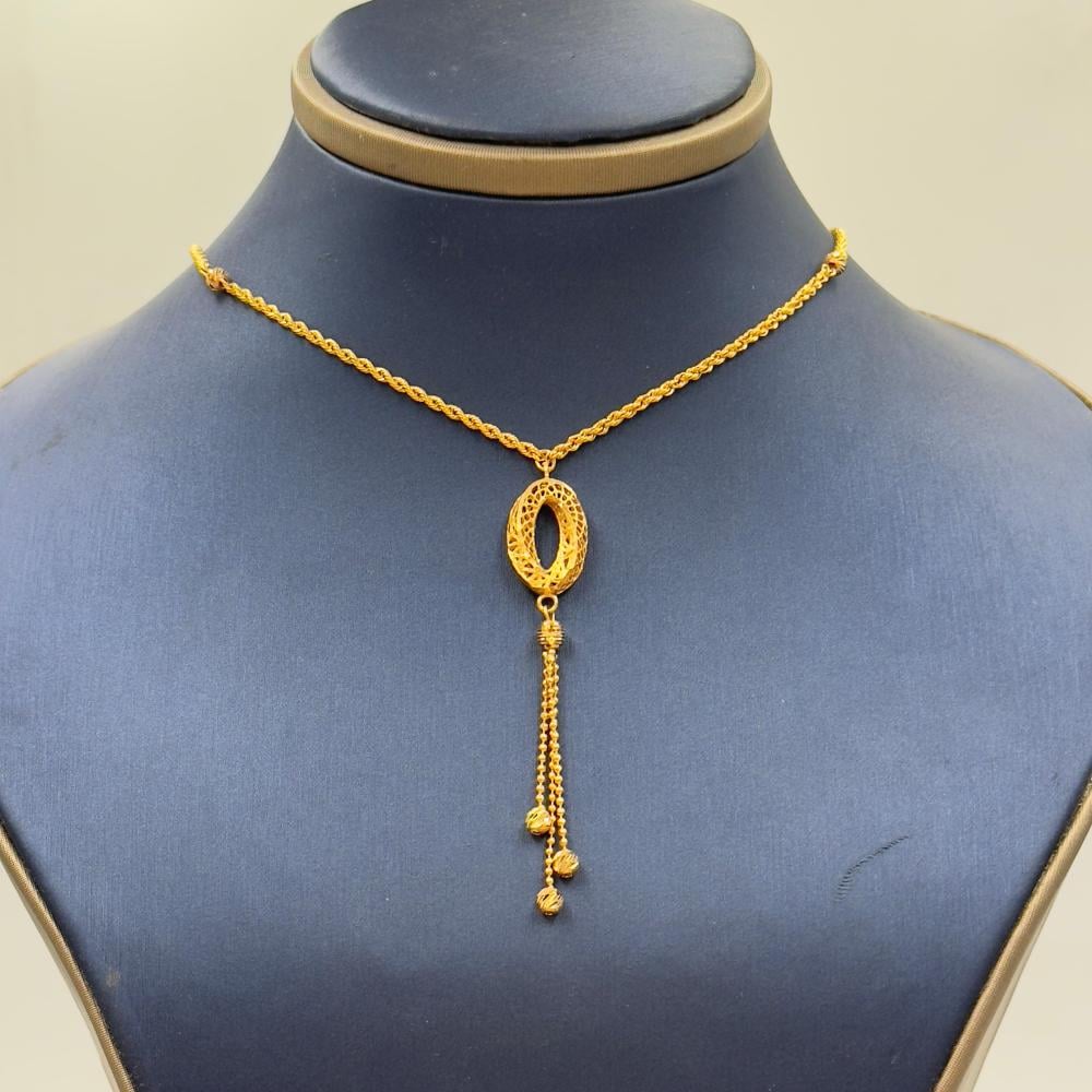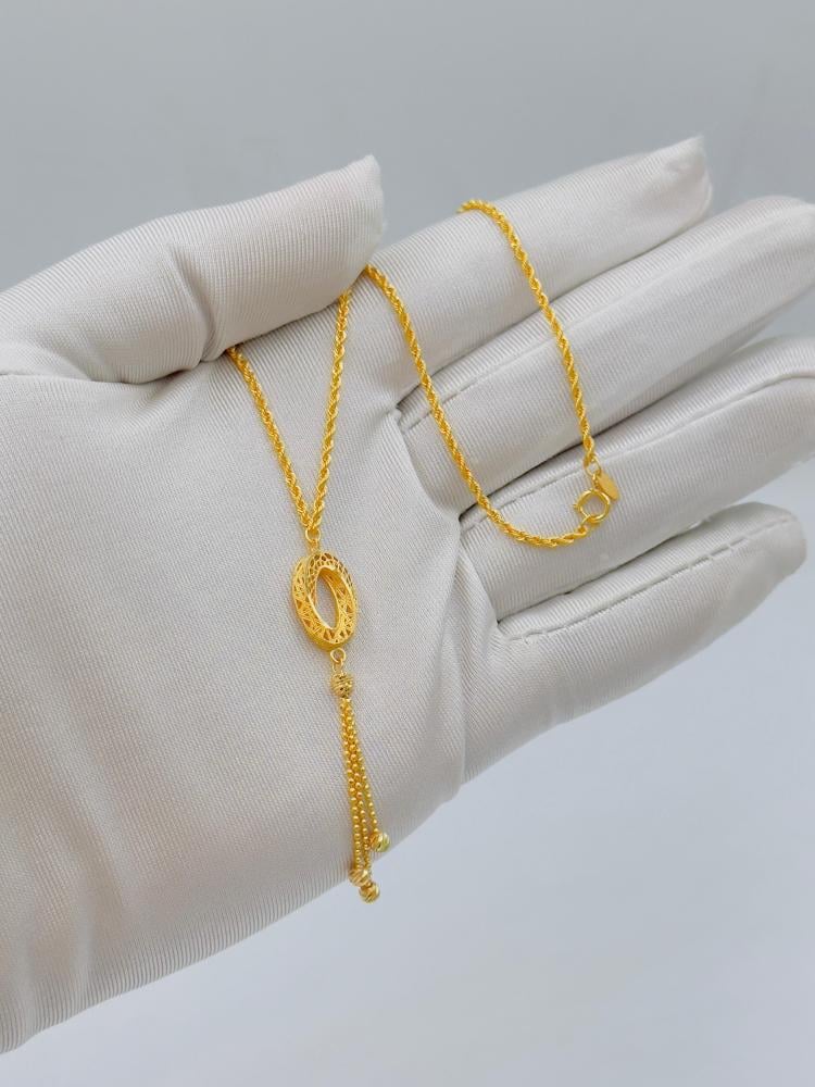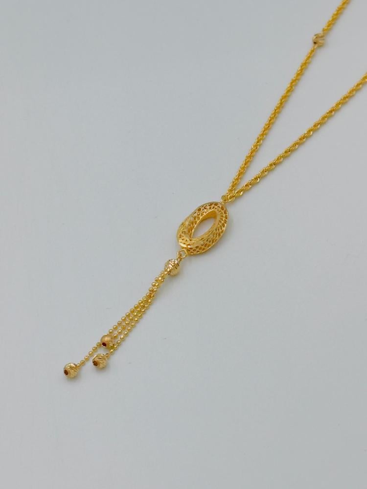• Design: A fine chain with a central hollow oval-shaped pendant, featuring elegant gold tassels with small decorative spheres