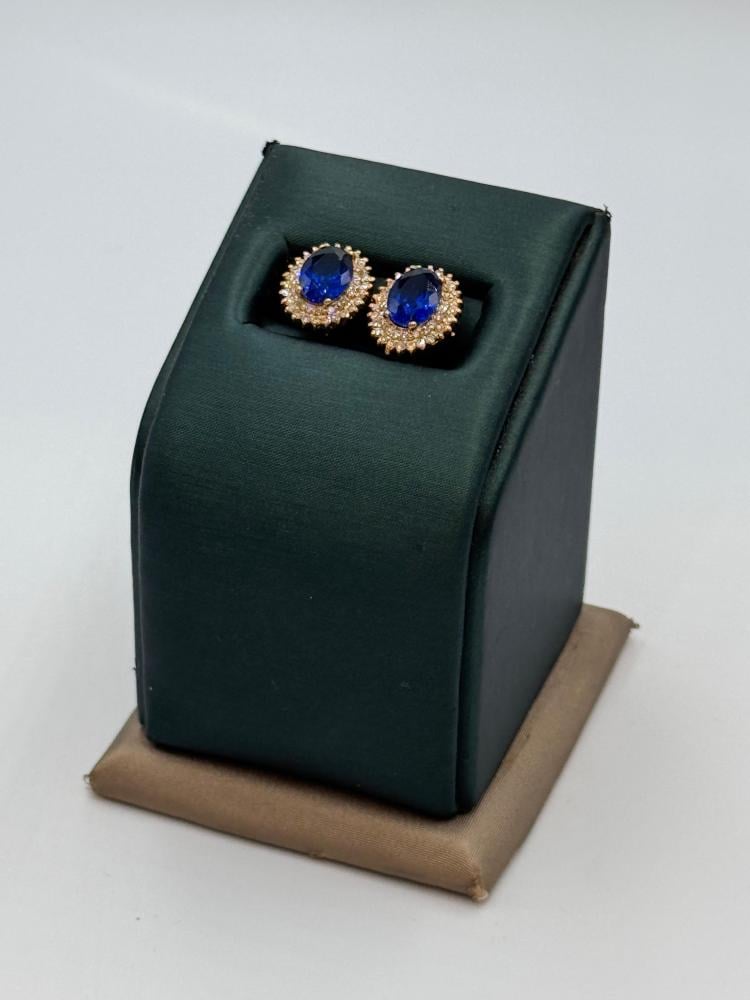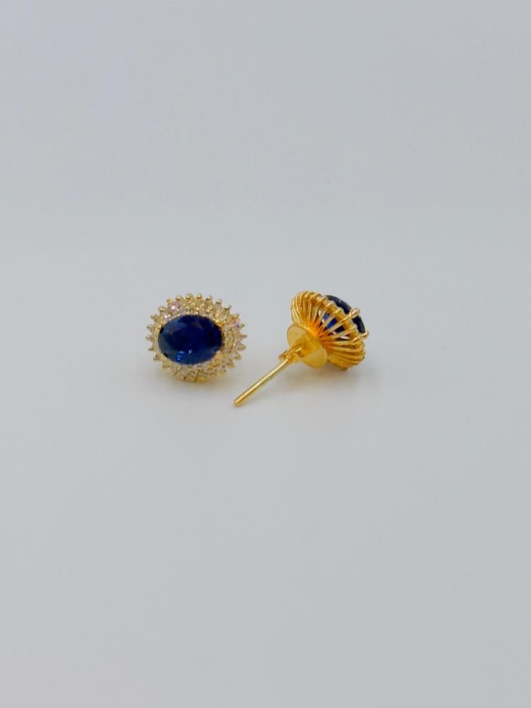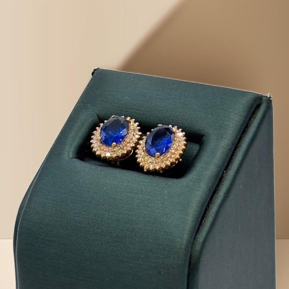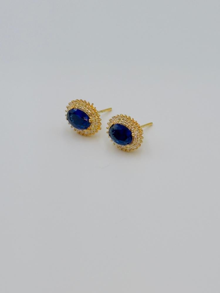 🟡 Description: 18K Gold Diamond Earrings with Blue Center Stone – Royal Elegance in Every Detail