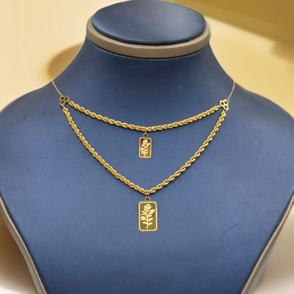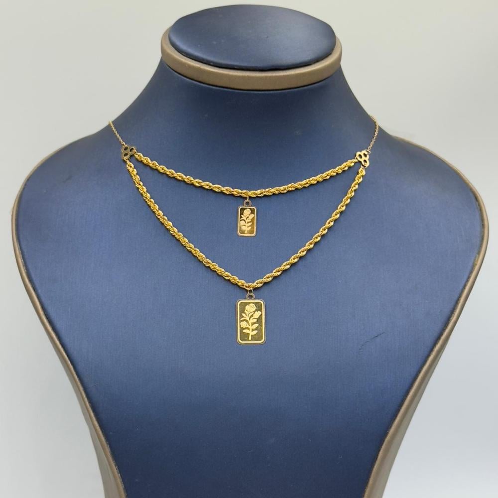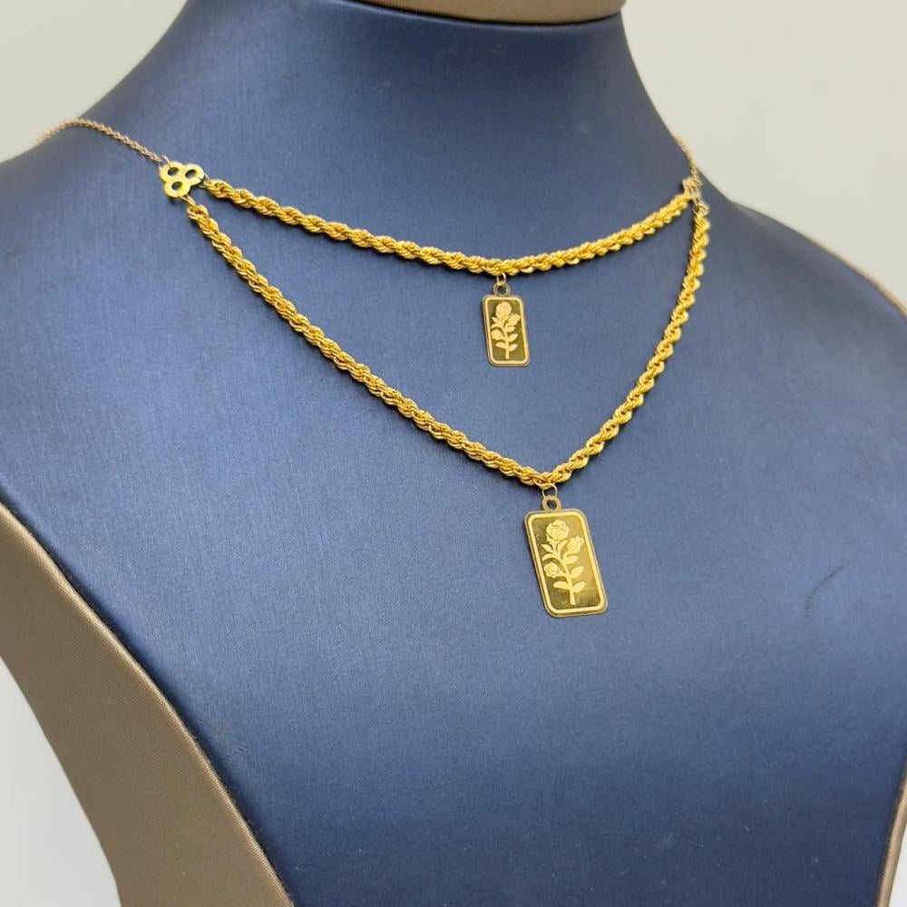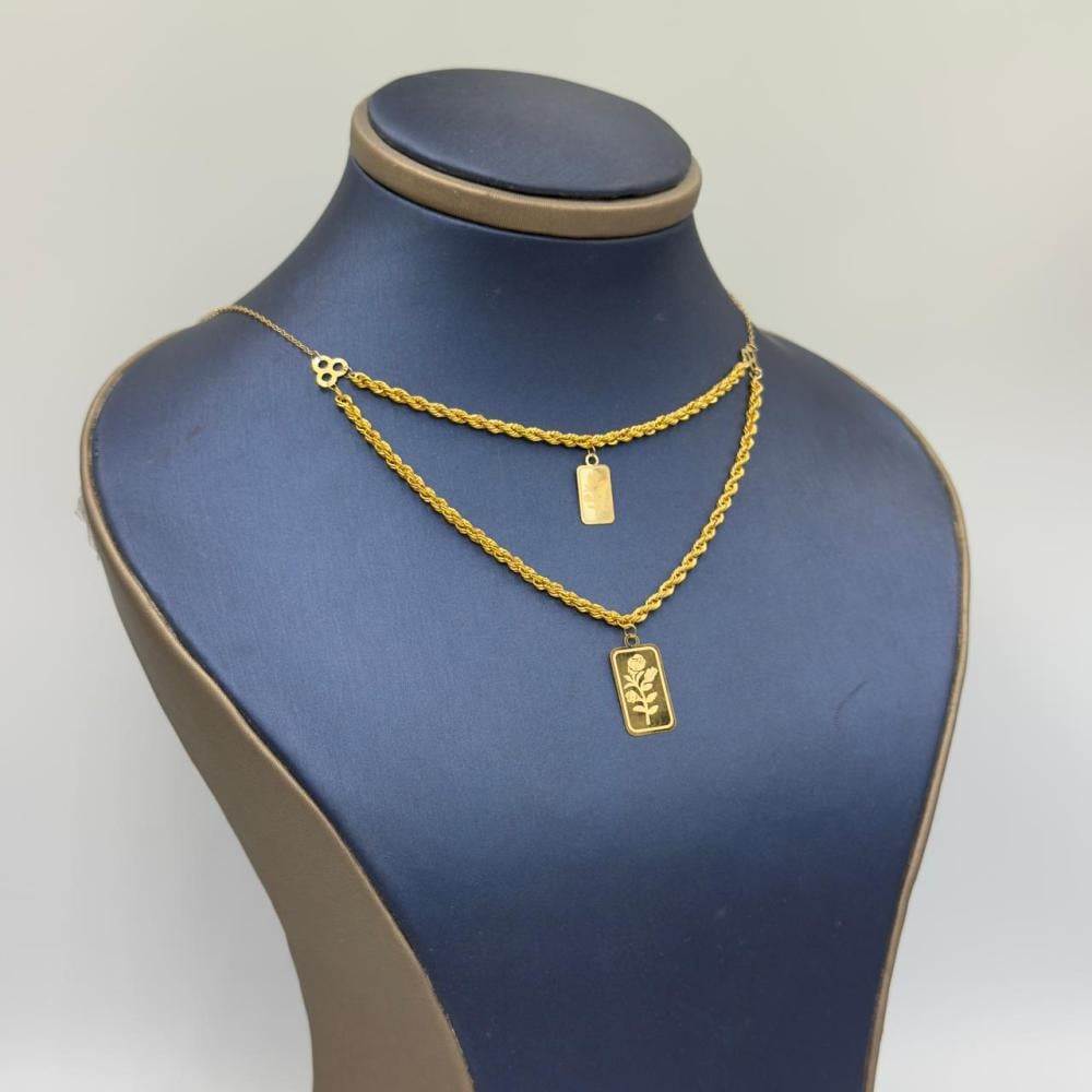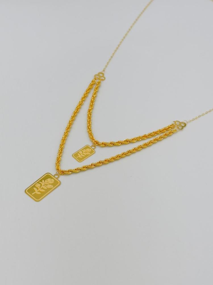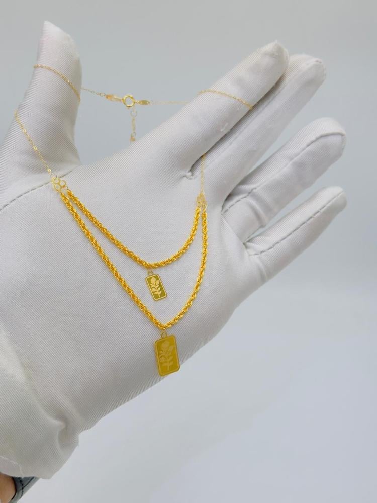 Description:A stunning double-layer spike necklace crafted from pure 21K yellow gold. With a weight of 2.43 grams and a length of 16 inches (40 cm), this elegant design blends modern style with timeless luxury, making it perfect for any occasion.