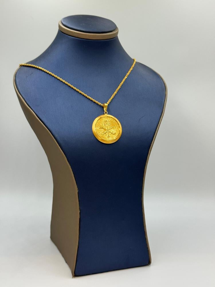 Shine with Pride with this elegant 21K gold necklace, adorned with a stylish pendant featuring the Kingdom of Saudi Arabia’s emblem – two swords and a palm tree – a symbol of dignity and prosperity. This design reflects national identity with a luxurious and distinctive style, perfect for those who take pride in their heritage.