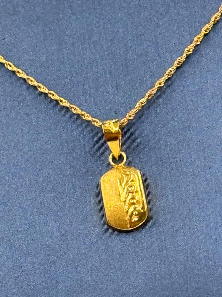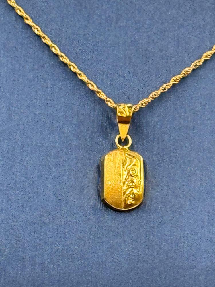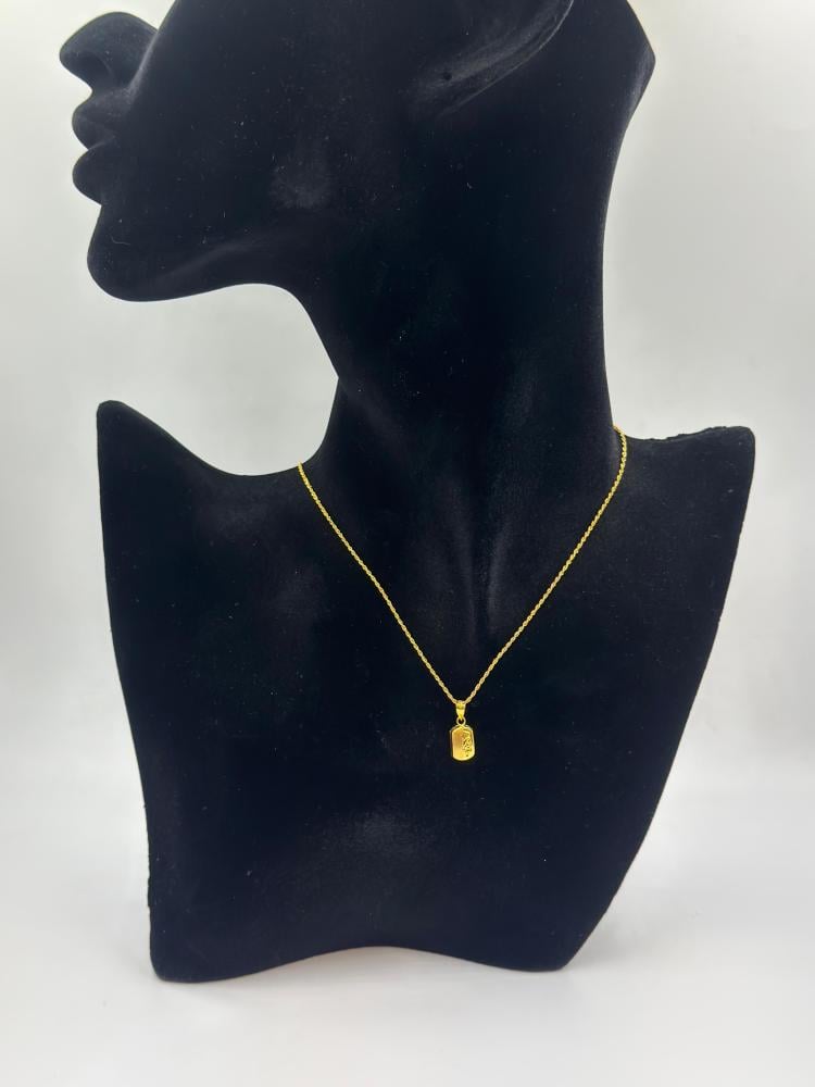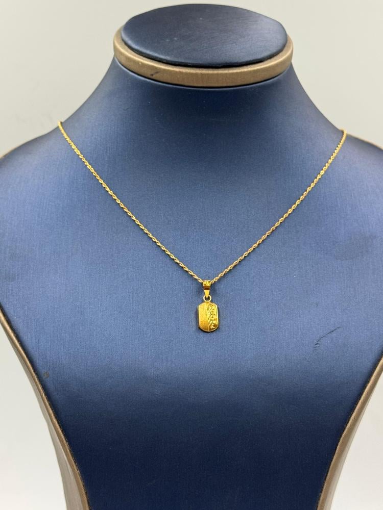 Enjoy the allure of pure gold with this luxurious 18K gold necklace, crafted with precision and elegance. Featuring a sleek and stylish gold pendant, this necklace combines sophistication and simplicity. Weighing 0.70 grams and measuring 18 inches (44 cm), it’s lightweight and delicate, making it perfect for both everyday wear and special occasions.