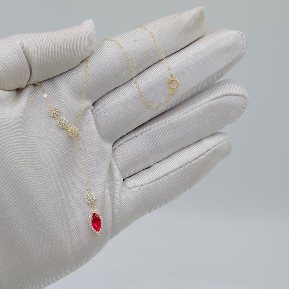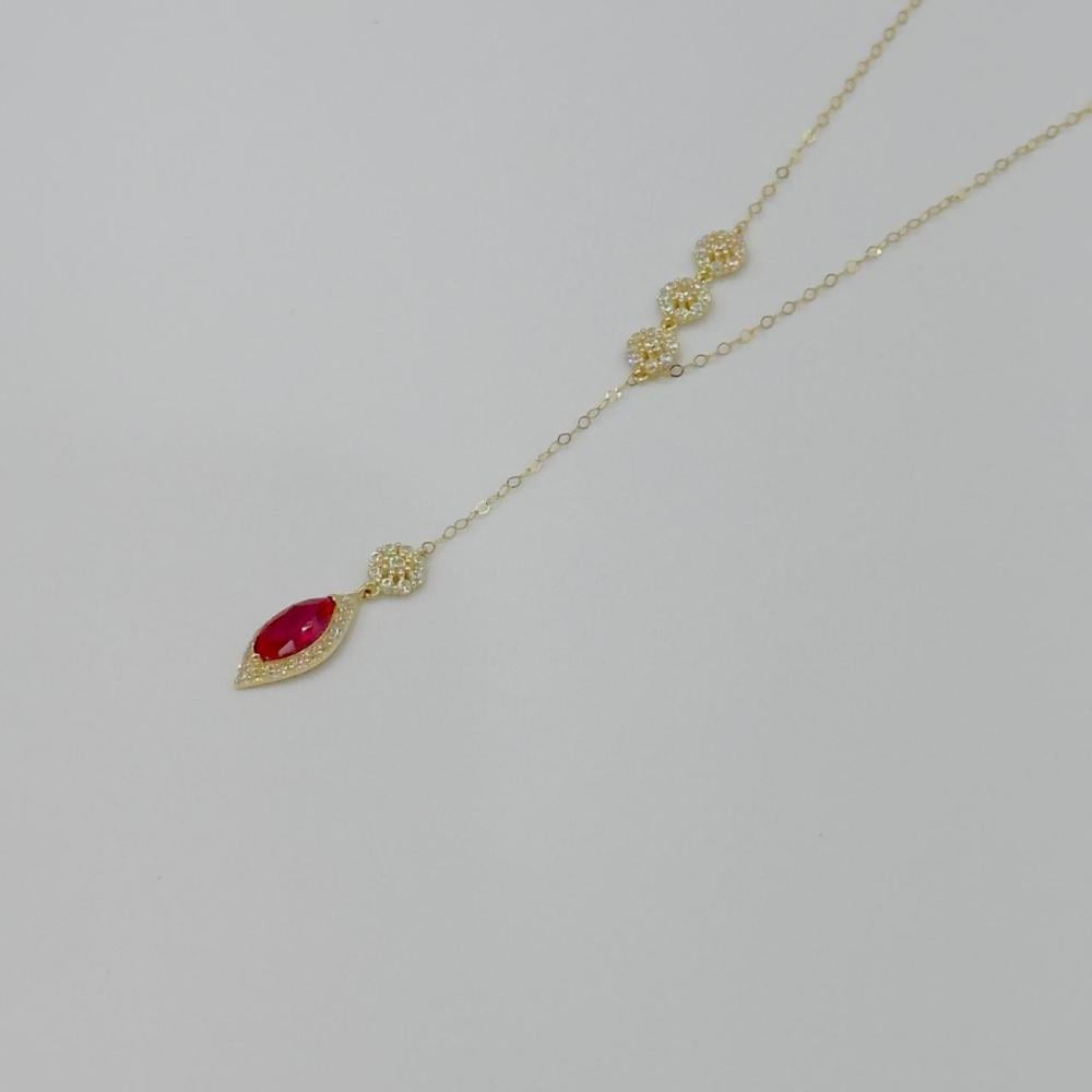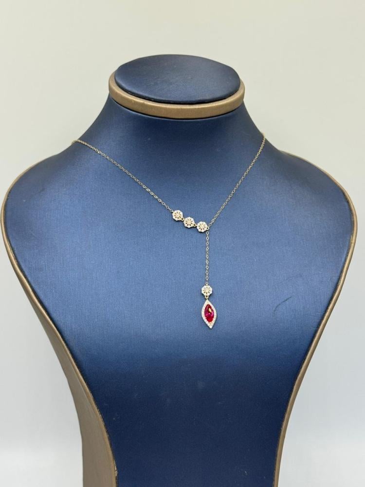 - Design: Delicate chain with graduated stones and a luxurious red gemstone