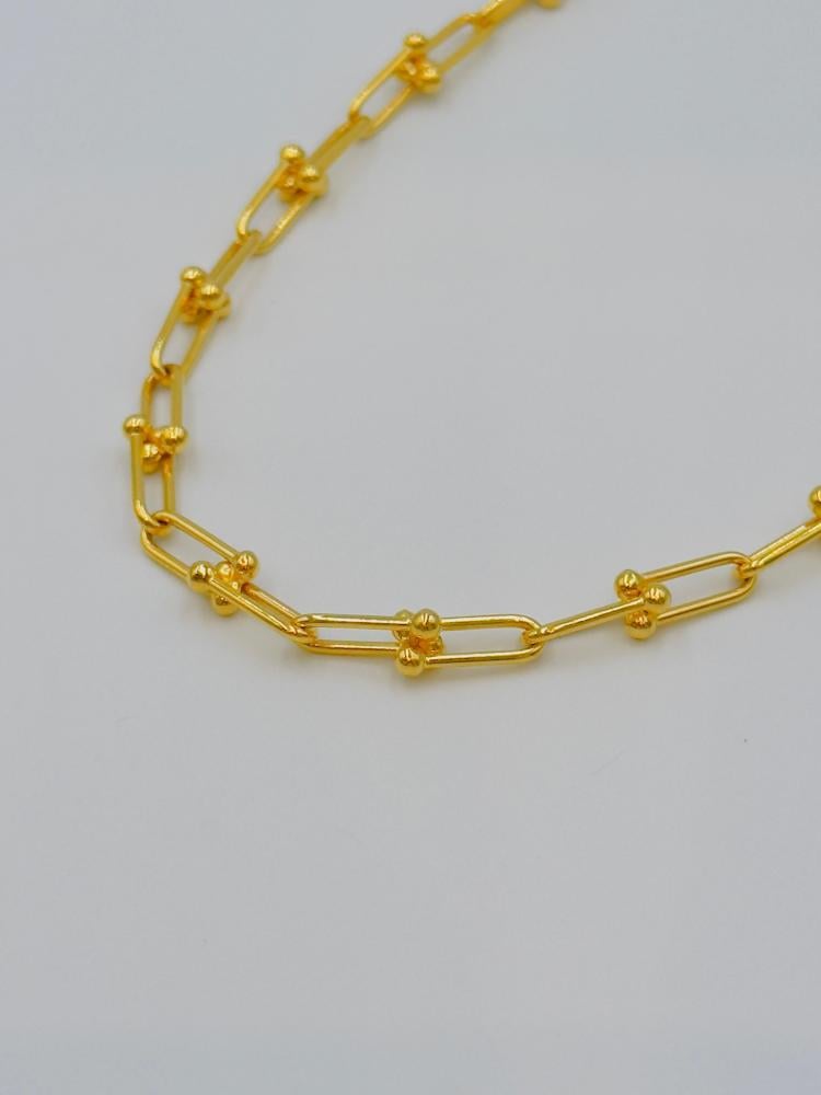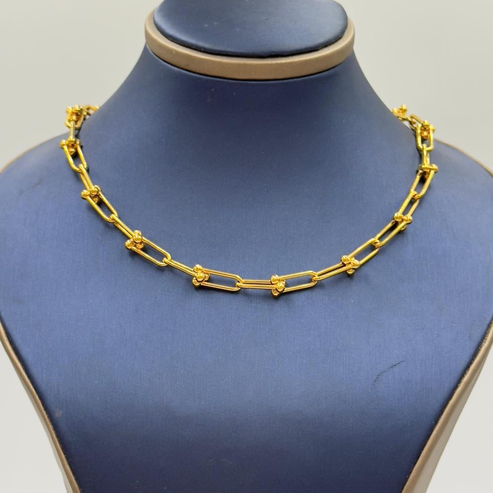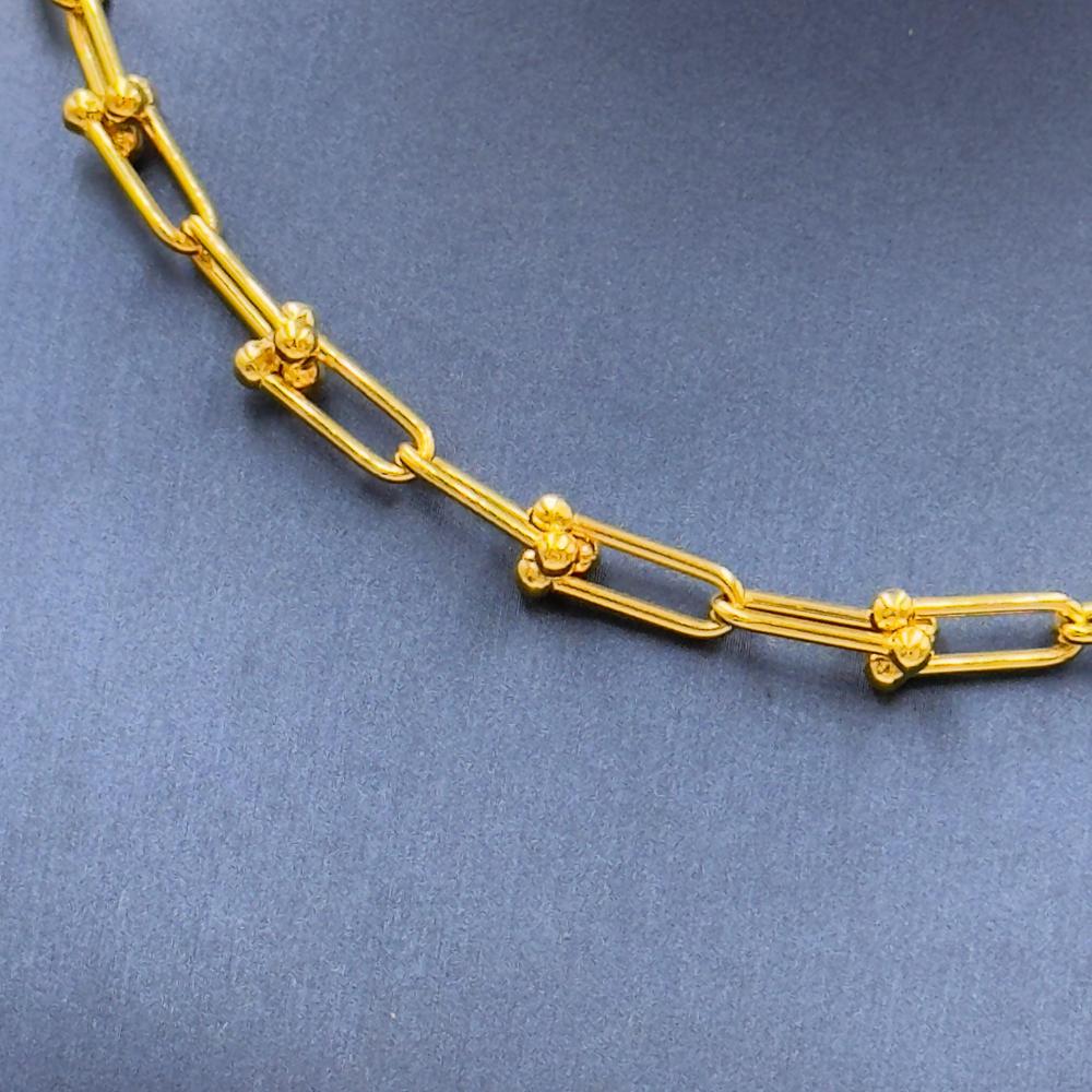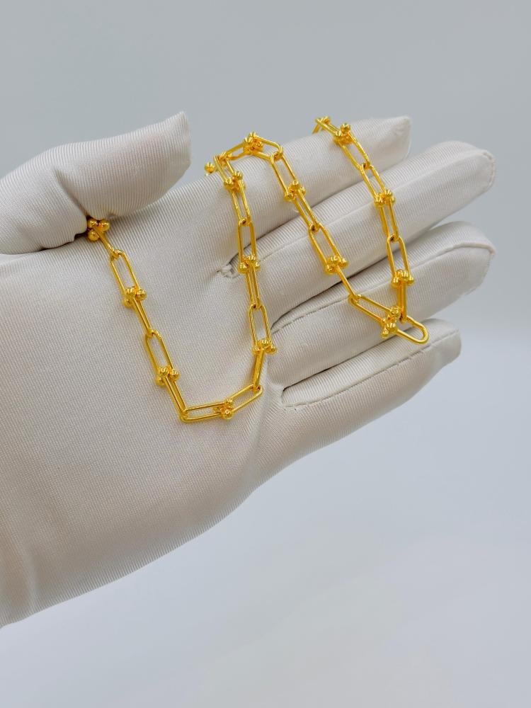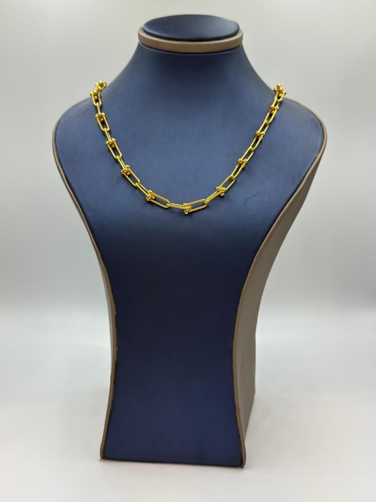 📋 Product Description: Stand out with a refined look wearing this exquisite Tiffany-style necklace, crafted from pure 21K yellow gold. This elegant piece features elongated rectangular links adorned with small gold beads, offering a perfect blend of luxury and modern design. Ideal for daily wear or as a luxurious gift.
