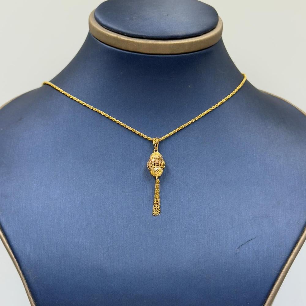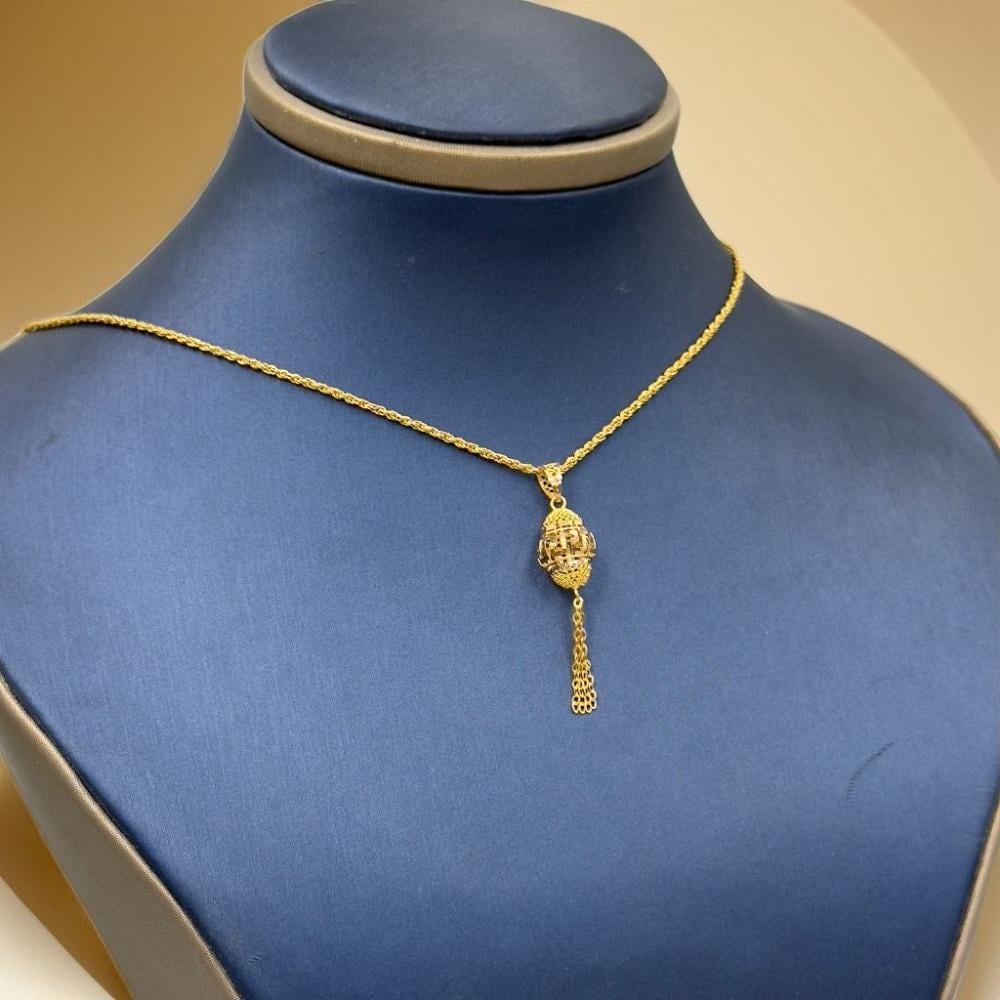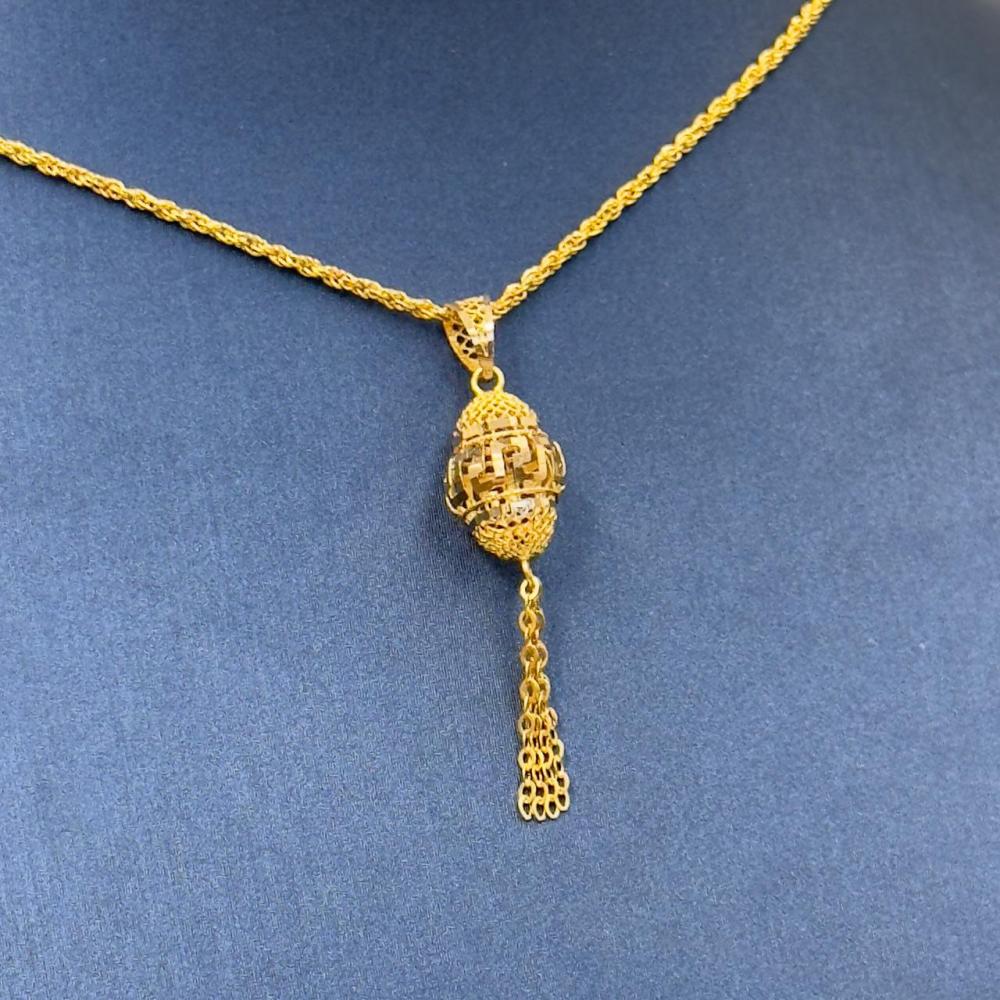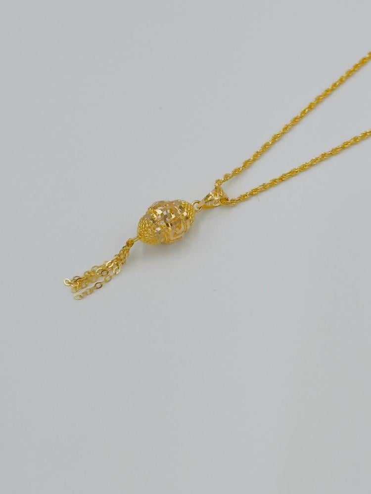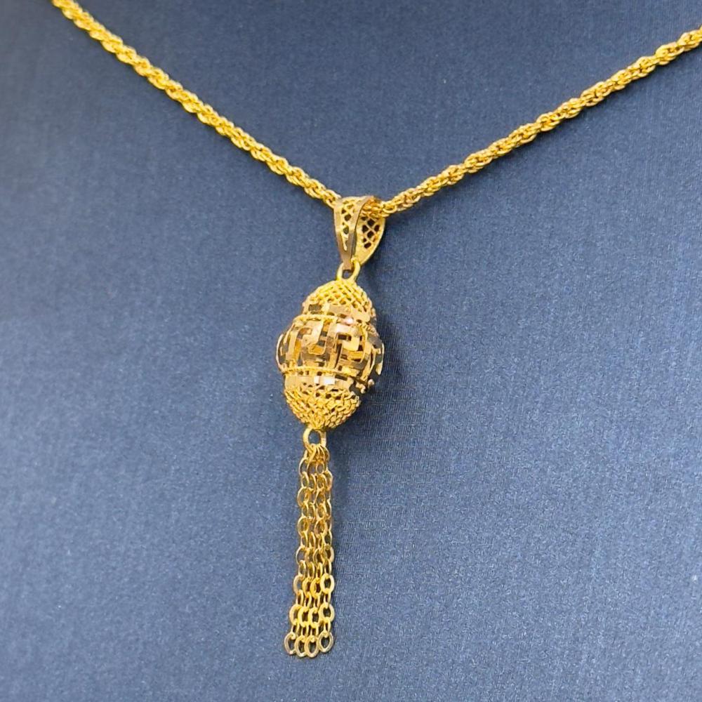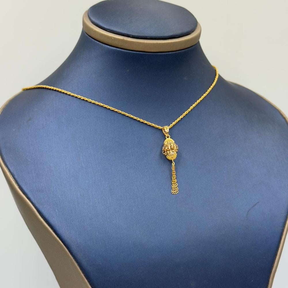 Description:A stunning 21K gold necklace featuring an elegant oval pendant adorned with intricate Versace-inspired engravings.