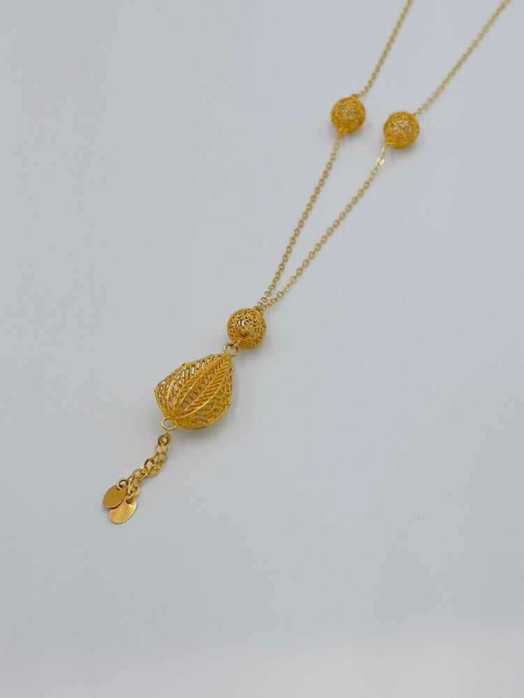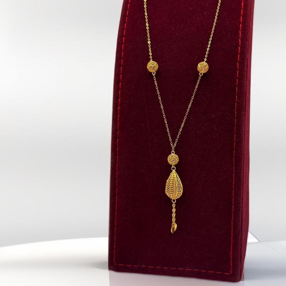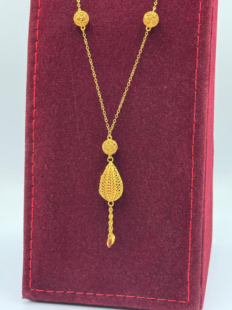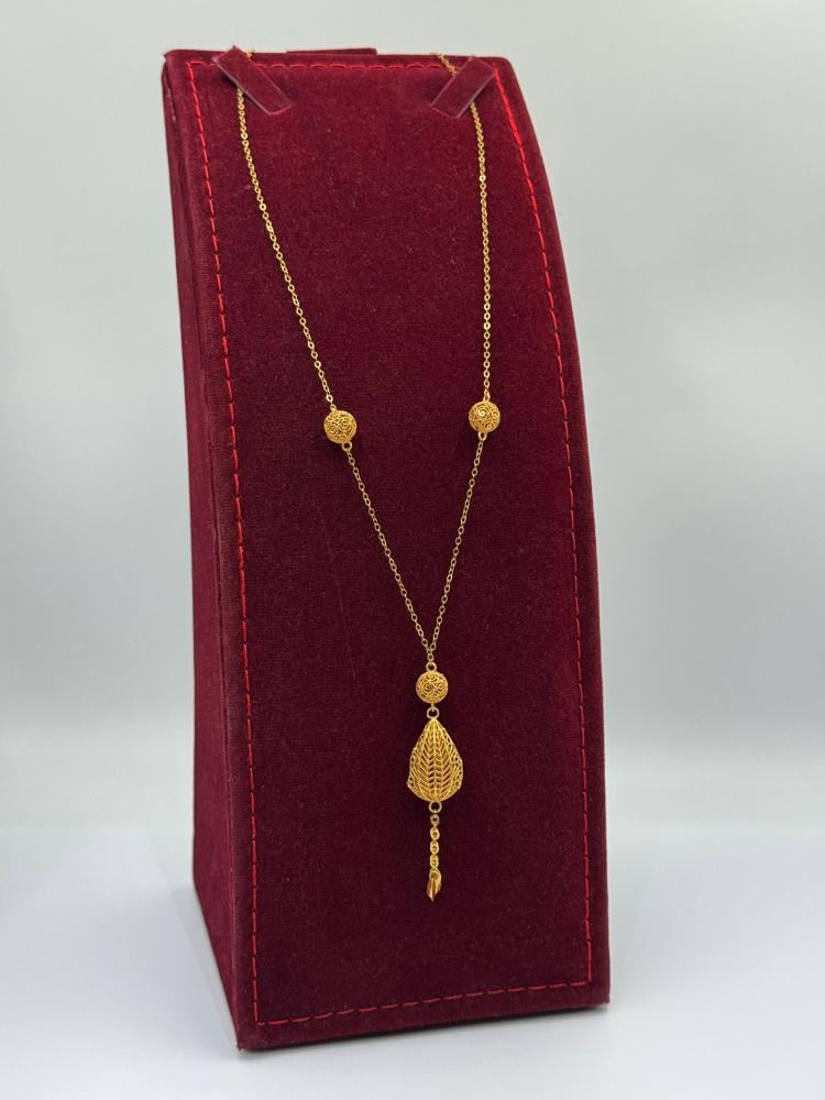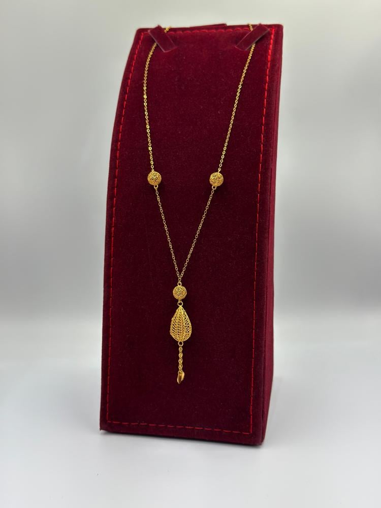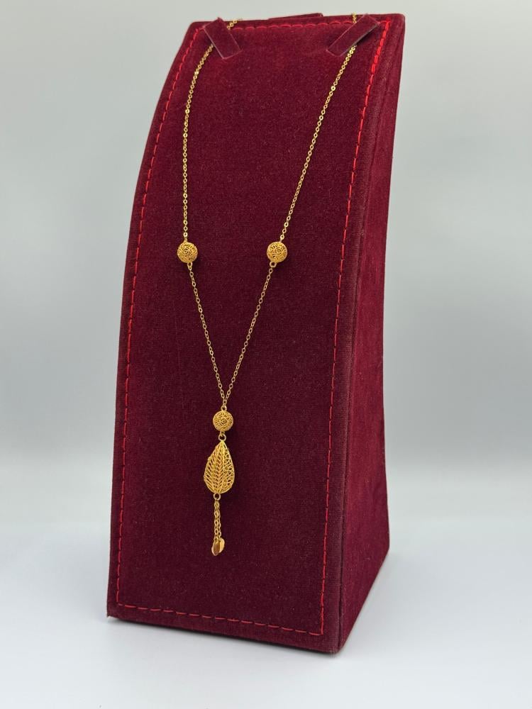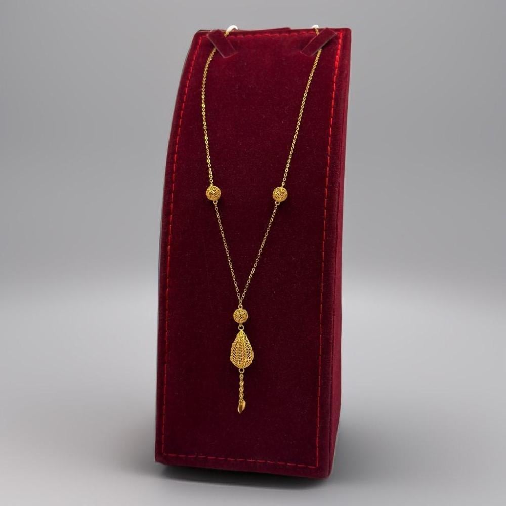 Description: A luxurious 21K gold necklace weighing 5.76 grams, featuring a delicate design that combines ornate gold beads with an elegant leaf-shaped pendant, adding a charming natural touch. A perfect choice for a refined, feminine look—ideal for both special occasions and everyday elegance.