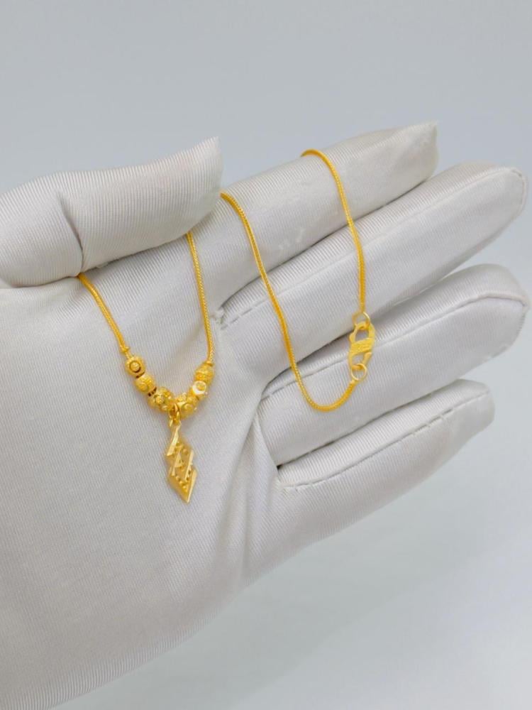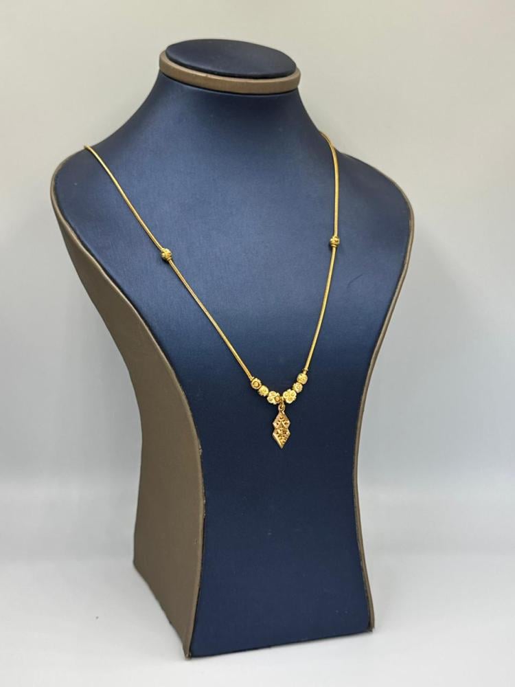 ✨ Product Description :A luxurious 22K gold necklace featuring a graceful dangling pendant with interlinked gold beads. Its refined design blends elegance and simplicity, creating a radiant piece that highlights the beauty of pure gold. Perfect for women who appreciate sophistication and modern charm in every detail.