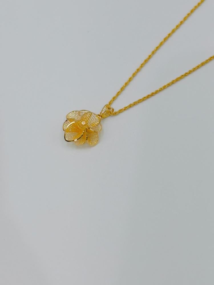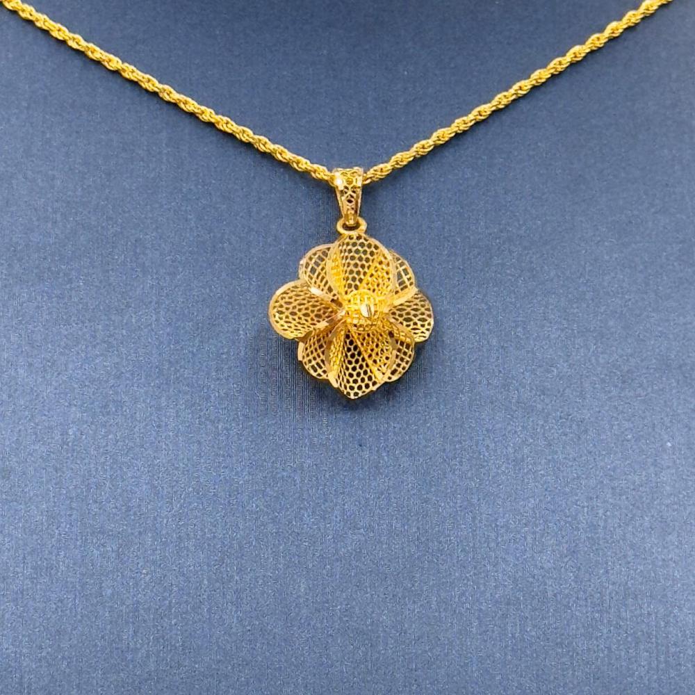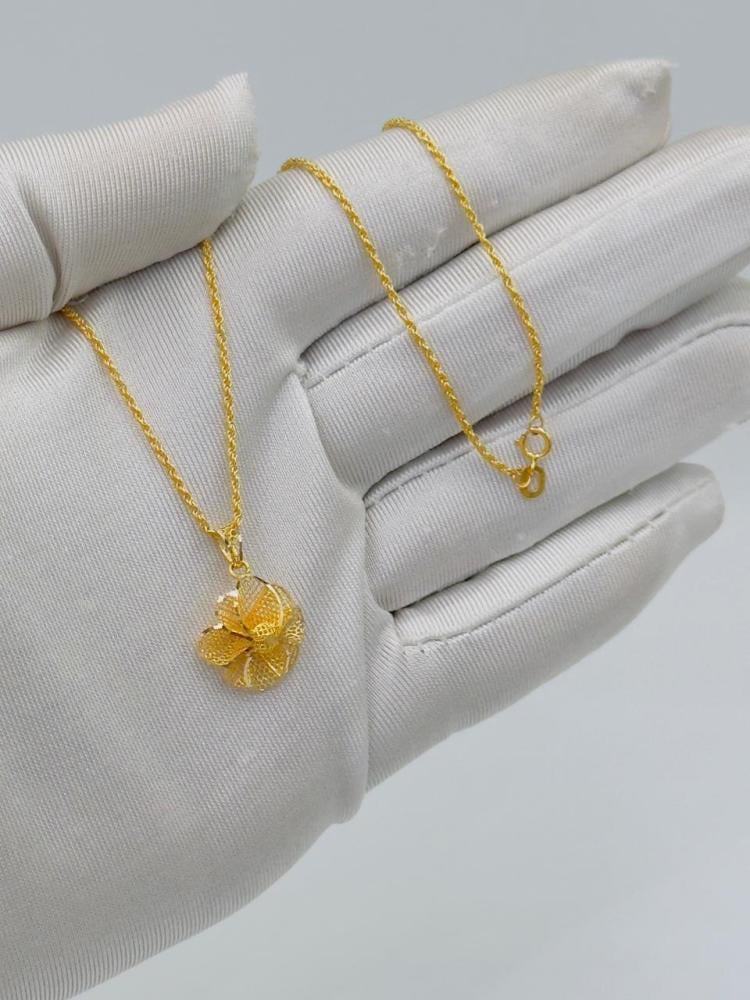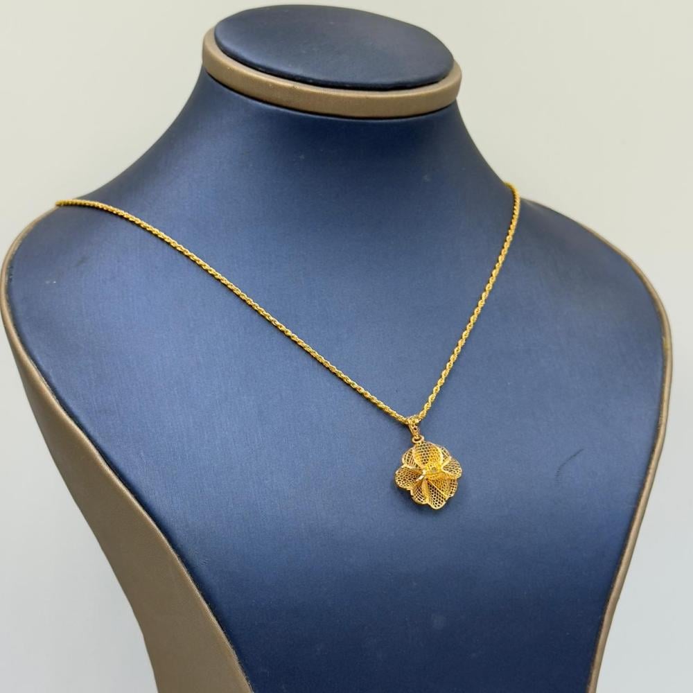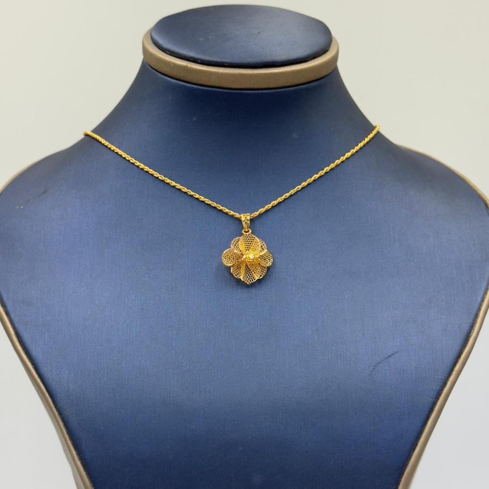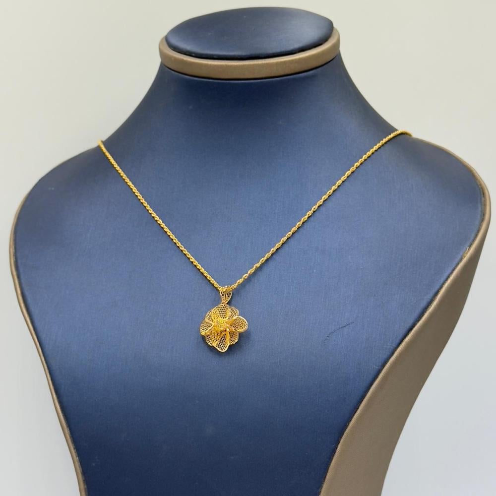 📝 Product Description: A 21K gold necklace featuring a stunning 3D rose pendant paired with a twisted gold chain — the perfect blend of delicacy and luxury. Its radiant shine and lightweight design make it ideal for daily wear or as a timeless gift that celebrates feminine beauty.