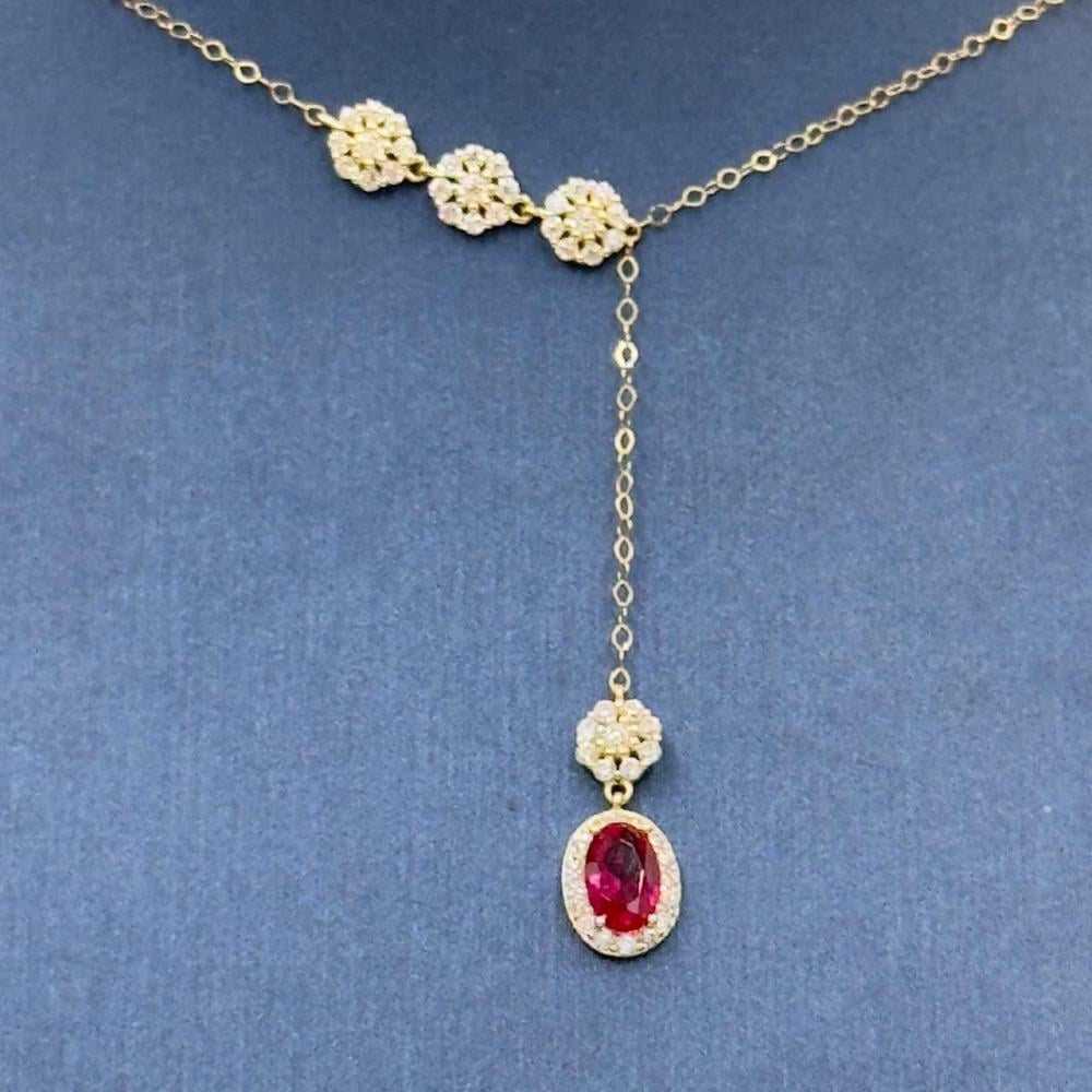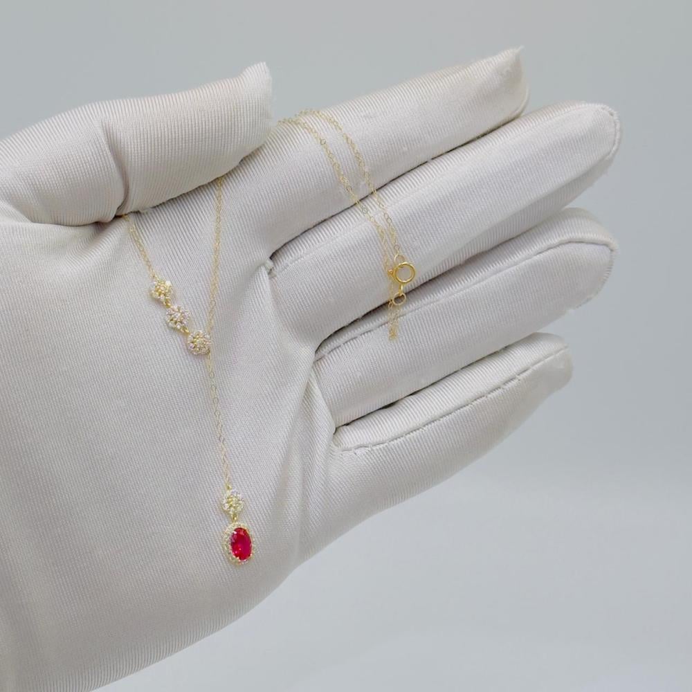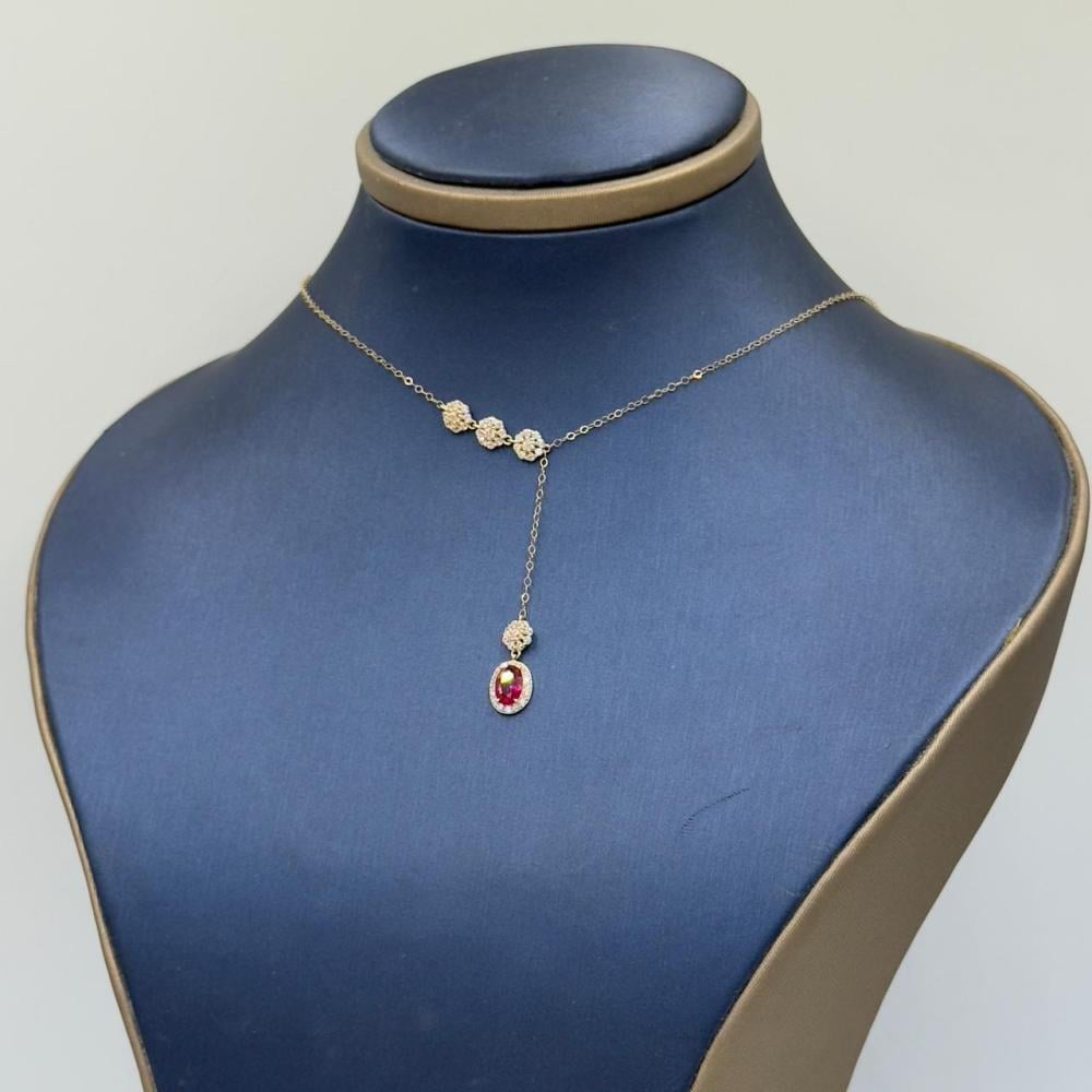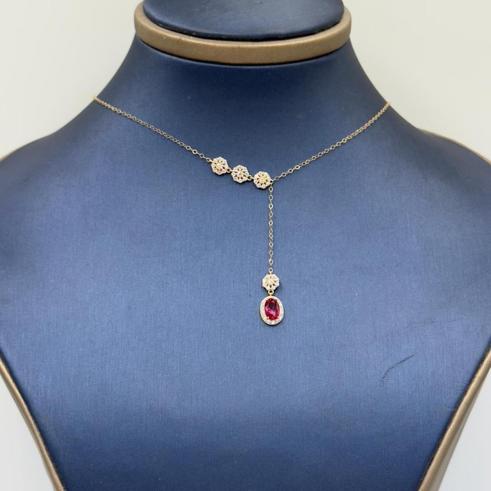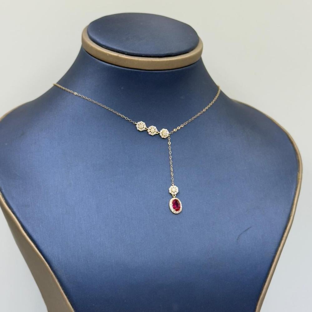 Description:Embrace luxury and sophistication with this stunning 18K gold necklace, adorned with a striking red gemstone that adds a touch of elegance and allure to your everyday and special occasions. Its delicate design makes it the perfect addition to any outfit.