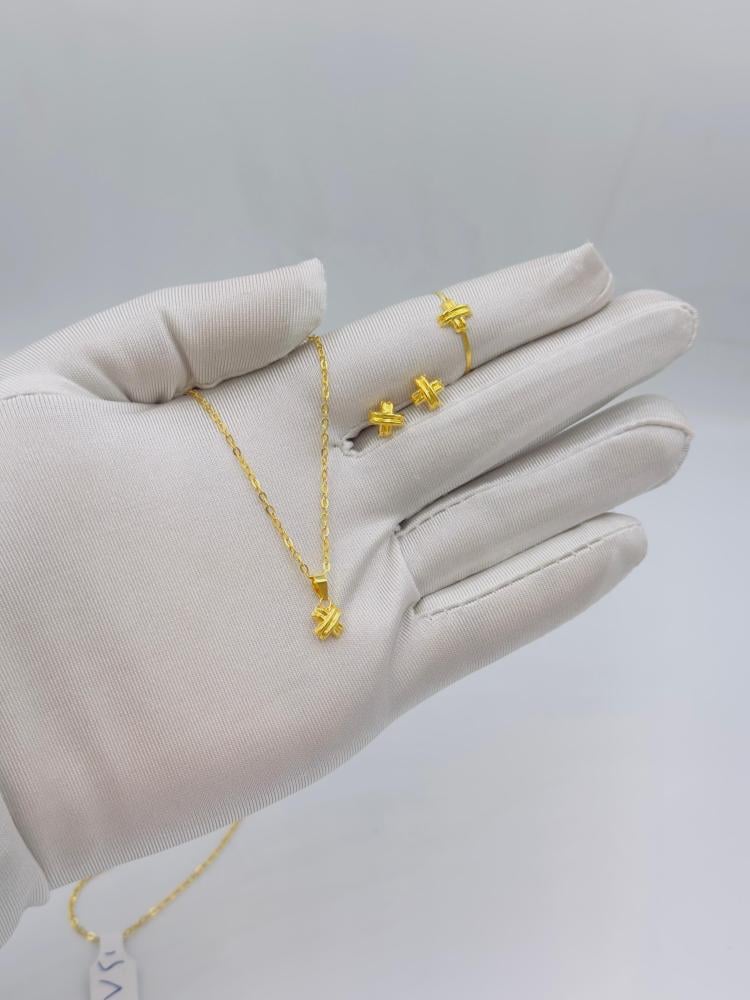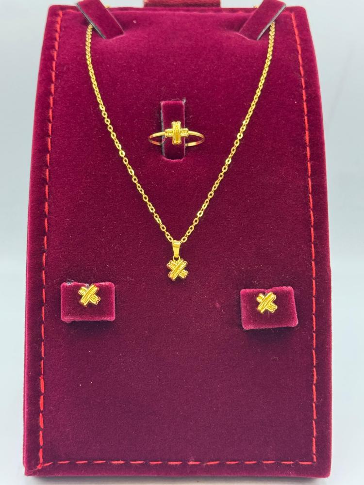 Elevate your elegance with this modern and delicate 18K gold jewelry set. Featuring a flower-inspired design, the set includes a 44 cm (18-inch) necklace, matching pendant, a sleek ring, and coordinating earrings. Weighing just 1.58 grams, it’s the perfect choice for everyday wear or as a meaningful gift.