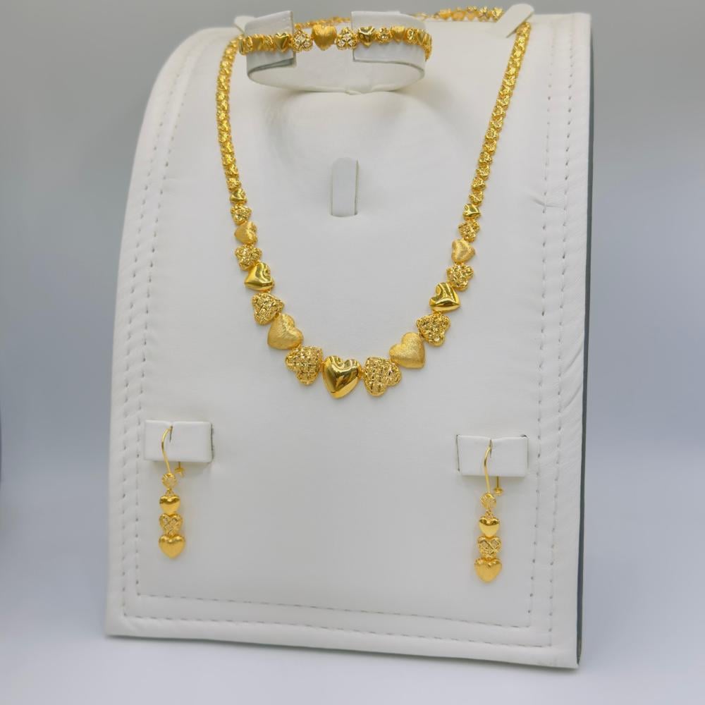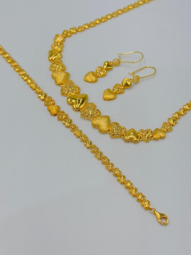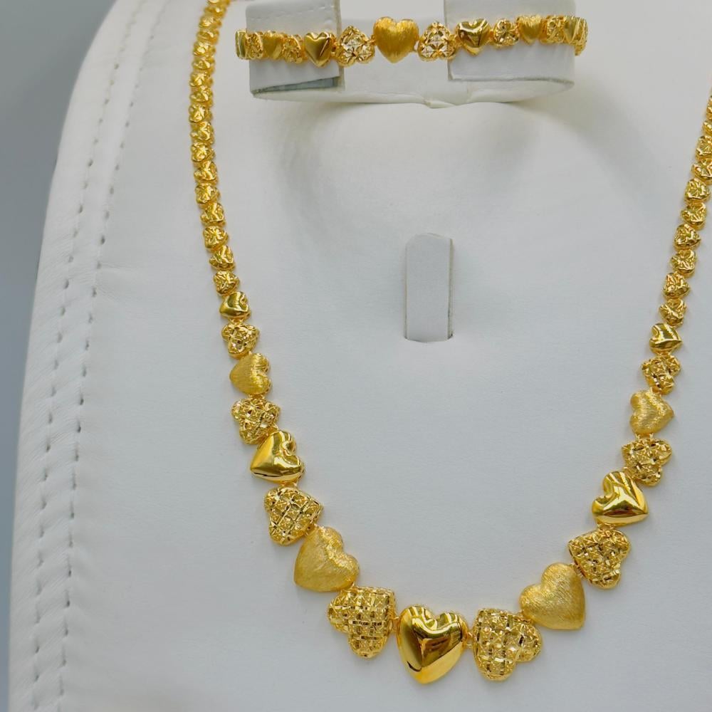 The necklace sits gracefully as a choker-style piece with a length of 18 inches (44 cm), paired with a matching bracelet adjustable from 7–8 inches (19–20 cm). With a total weight of 29.21 grams of pure gold, this set adds a luxurious and feminine touch to your everyday style or special occasions.